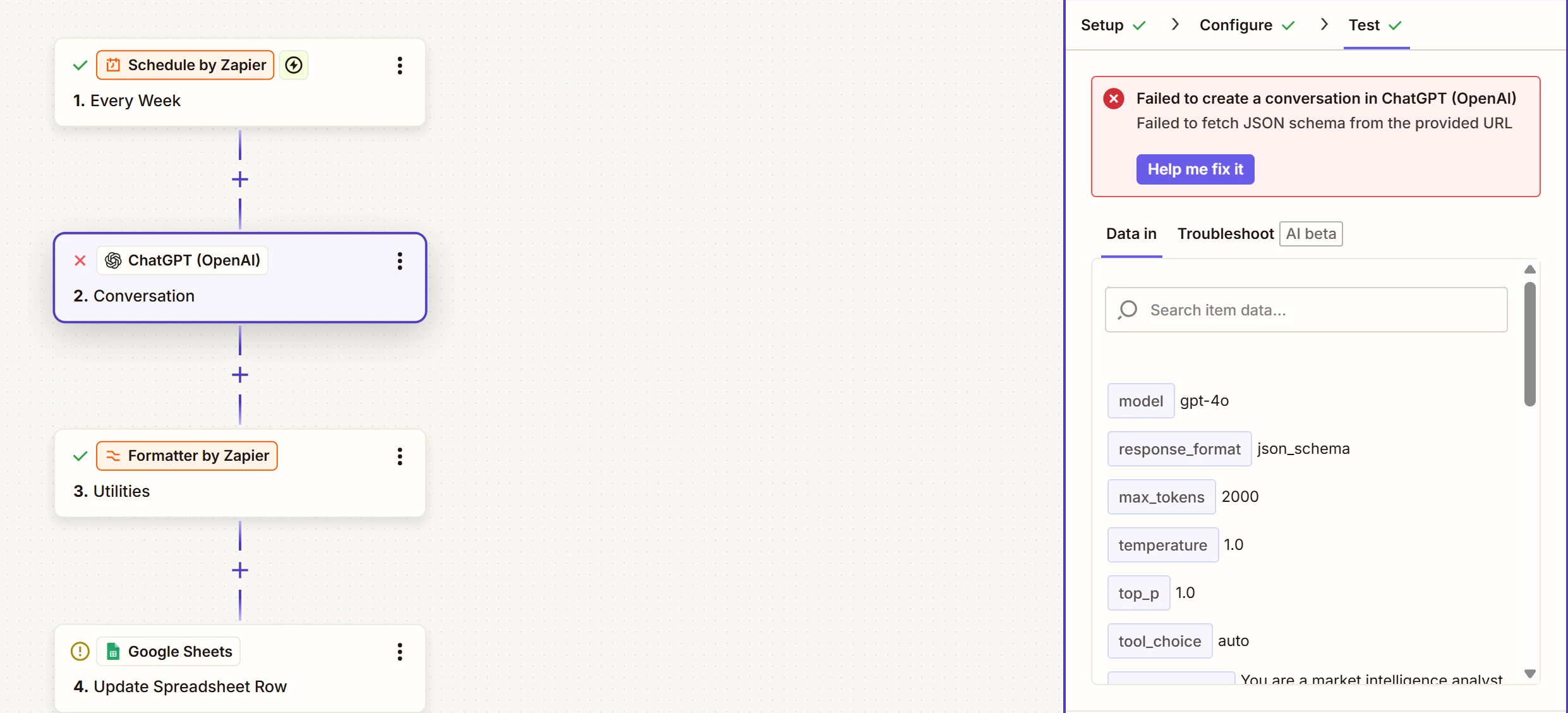 I'm trying to create a workflow for my research agent via CHATGPT to pump the data via data entry into my google sheet for market research using Zapier. I've tried a public gist via github, and JSONBin.io; nether worked. Zapier boots it back during test with "Failed to fetch JSON schema from the provided URL." Any help is greatly appreciated!