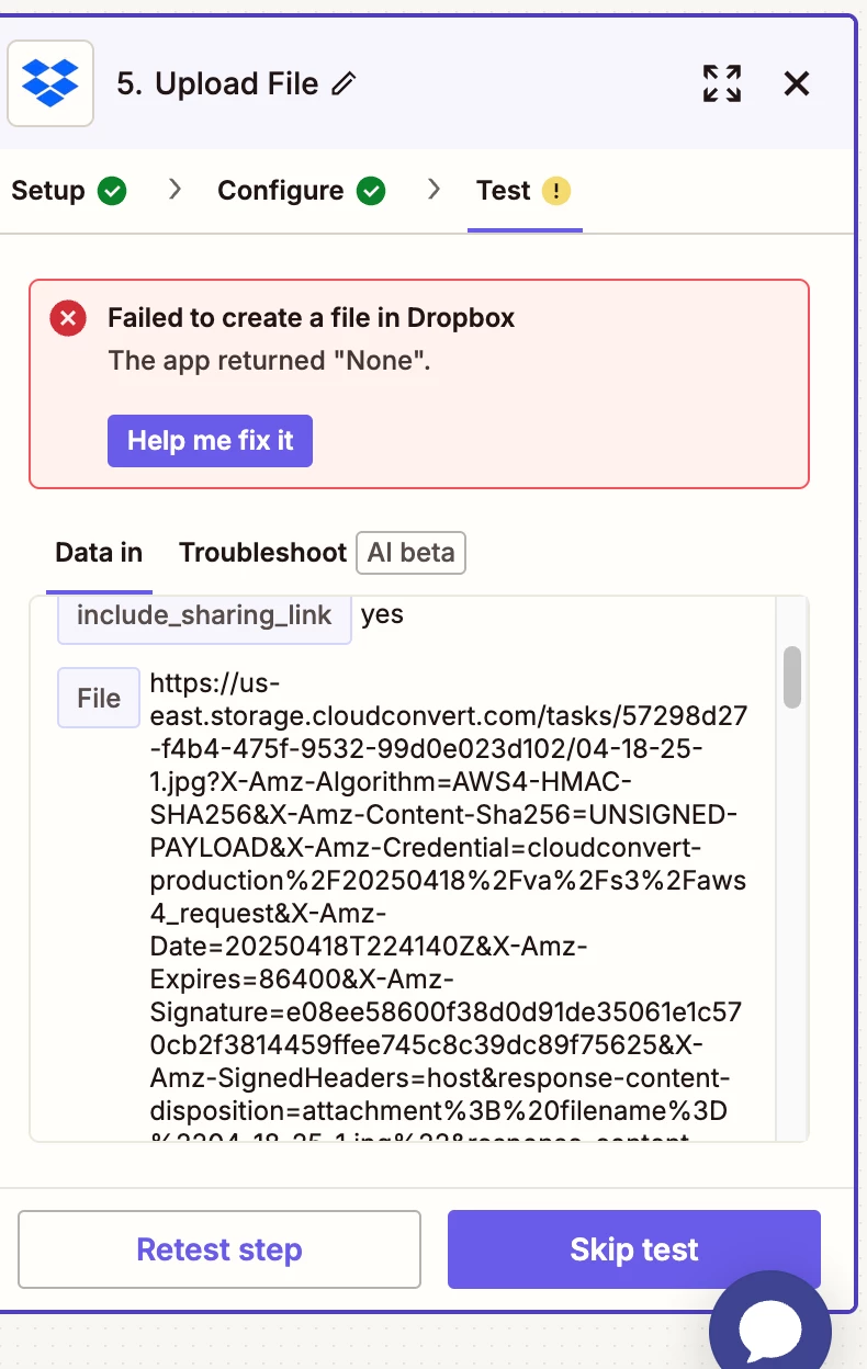 The issue: CloudConvert outputs multiple JPGs bundled into a ZIP, and I would like the individual JPG files saved directly instead. Is this possible? I have tried using webhooks, looping, and formatter with no solution in sight.
