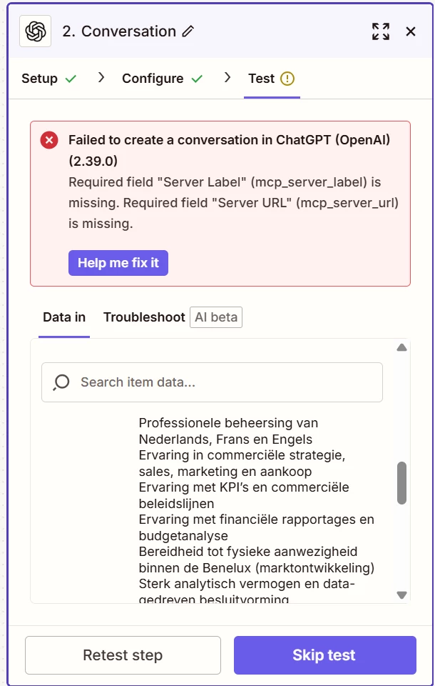 I am creating a zap which triggers a file with search criteria on Linkedin. I am stuck with the step connecting to Linkedin and perform the search for candidates based on the criteria. I am also using gpt-5 and agent mode to connect to linkedin via mcp from zapier. When i do it manually in gpt-5 it works, but not in zapier. it keeps testing and testing. But has an error: