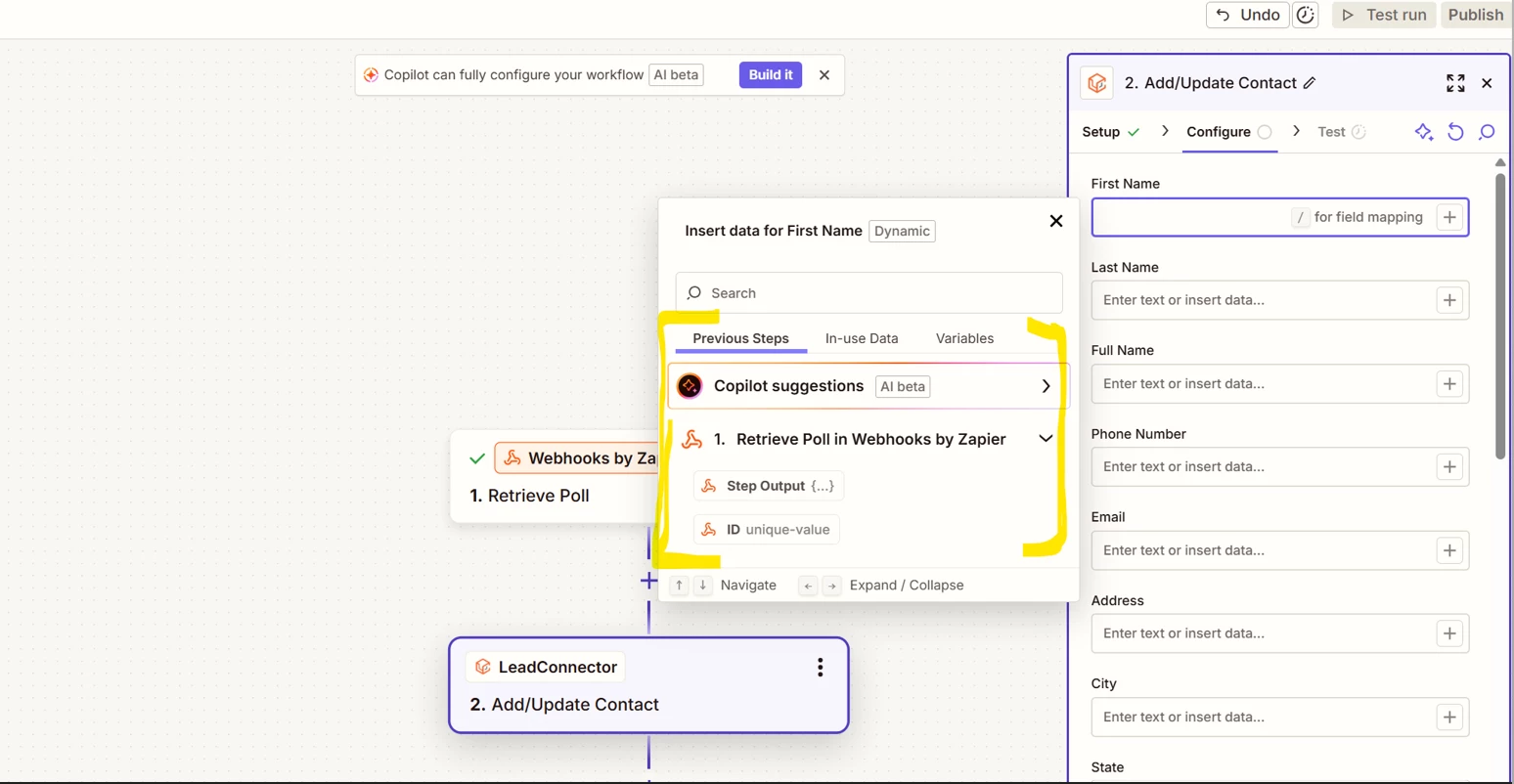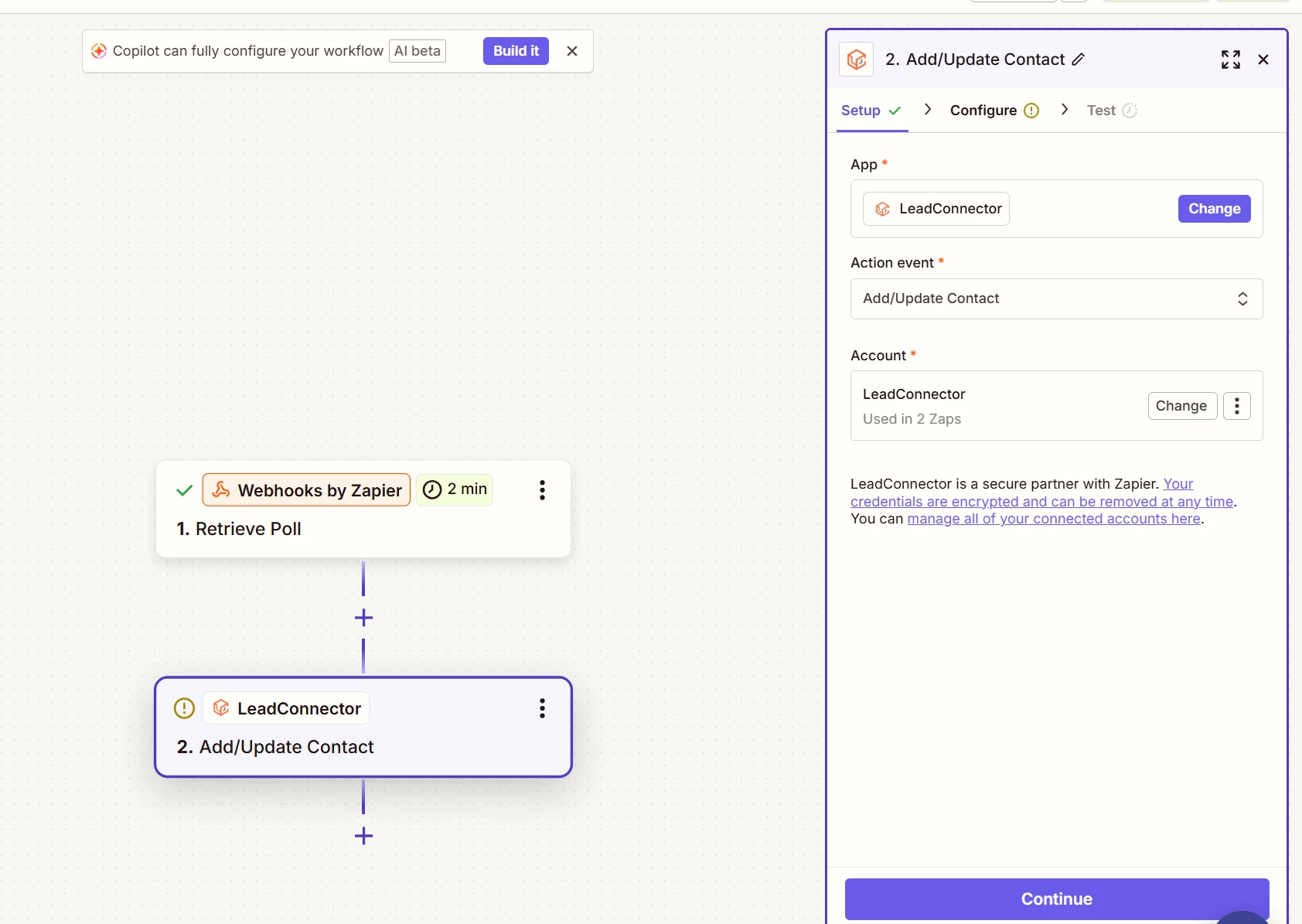 I’m creating a connection between Zapier and Ulinc using the webhooks option in Zapier. I’m able to paste the url just fine from ulinc to webhooks however when I try to test I get an error message that no data found. I proceed without testing to create a connection to Go High Level using LeadConnector. In the setup section,for App I’m selelcting LeadConnector, Action event = Add/Update Contact, Account - LeadConector (Refer to attached for the visual). The, I click on continue to go to Configure so I can mapps the fields from Zapier to GHL but the list of fields are not coming up in the drop down list. I’m I missing something here? Please help been trying to figure it out for days now