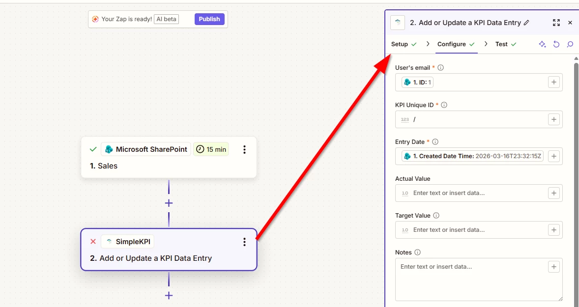 I am trying to use SharePoint with the trigger of “new list item”, pushing that data to my KPIs in SimpleKPI. I’ve got the connections and Zapier will pull sample data, however the mapping is in one of the formats SimlpeKPI will accept which is with the KPIs going down in rows. From SimpleKPIs website you can input Excel (or SP List) by, “Additional Data Structures There is also a secondary data structure that is compatible with SimpleKPI, this involves arranging the column names to match the names of the KPI. Please note that this data input structure does not allow for notes, Targets and KPI ID’s to be entered against a KPI. It is therefore only suitable for bulk loading KPI data when there are either no targets or the targets are consistent and there are no notes to be added to the entries.”