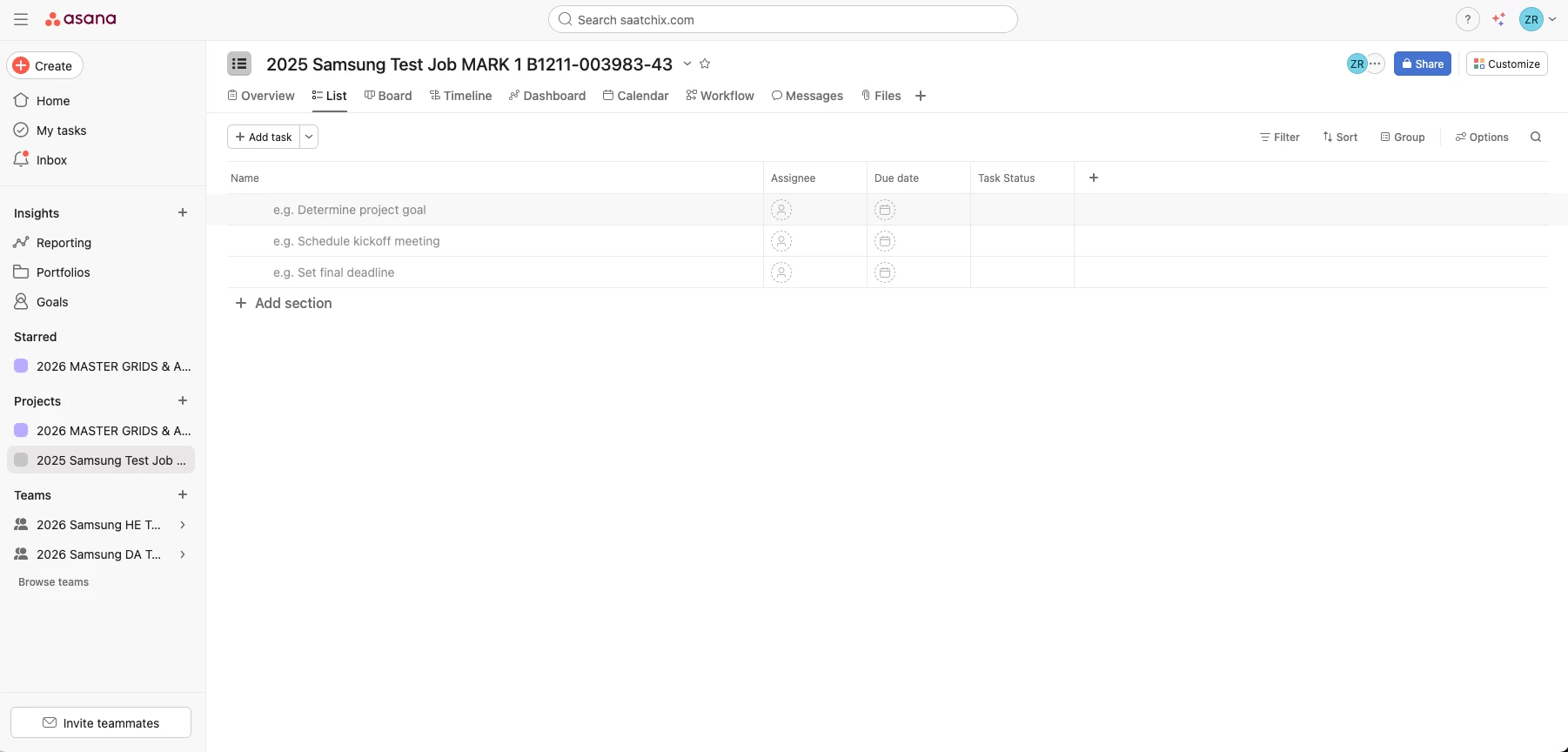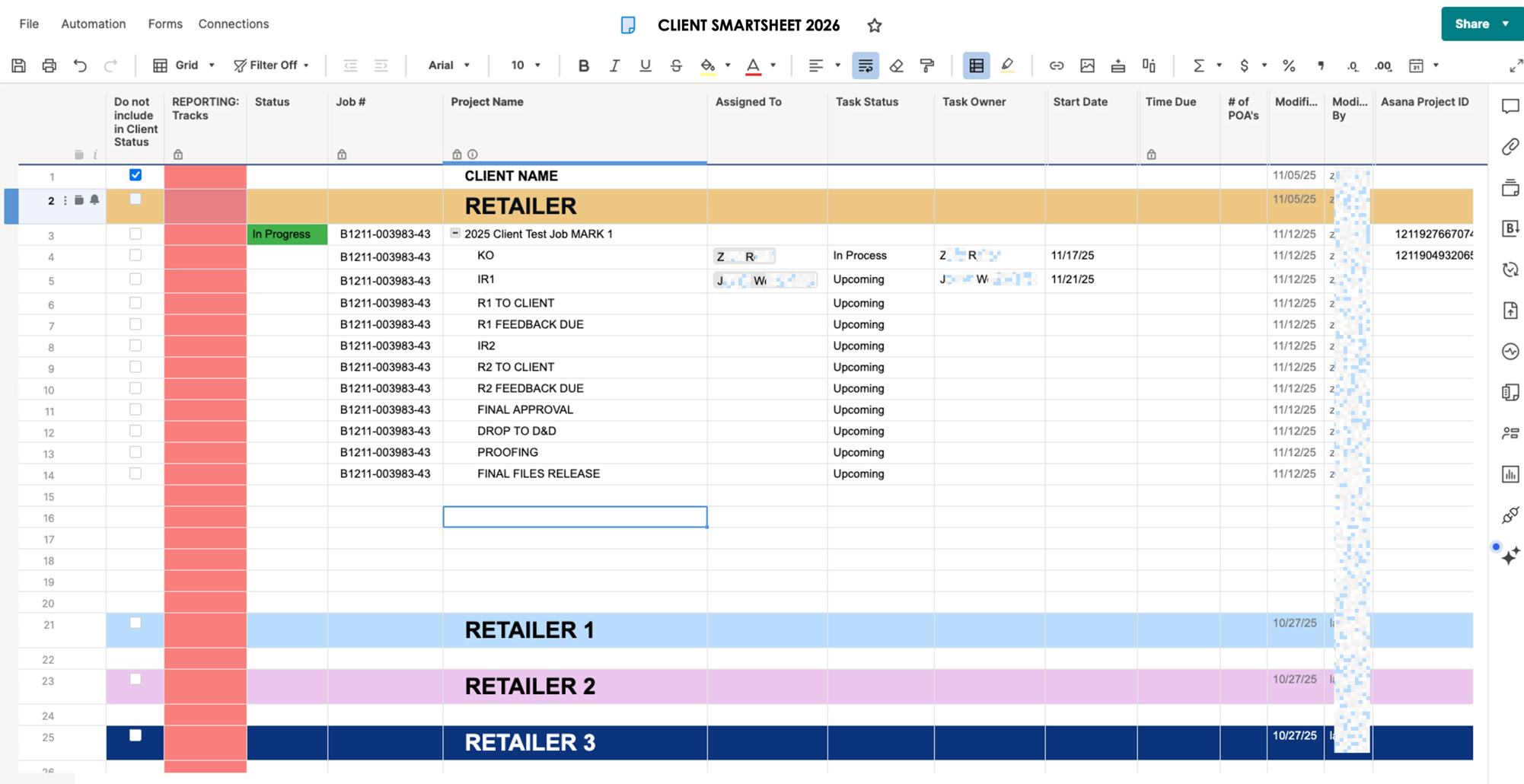 - Below is a screenshot of how our internal SmartSheet is set up. The sheet is broken into different sections by retailers. Under each retailer there would be a header row that carries the Job # and Job name. Under each header row are the specific tasks. Each task has it’s name in the “Project Name” column, which is the same column as the project name in the header row. The other columns are normal project info. I have added the final “Asana Project ID” as part of a previous attempt to set up the Zaps. The project header row has a collapse feature that nest each of the task rows below it- the task rows are indented vs the project header row.