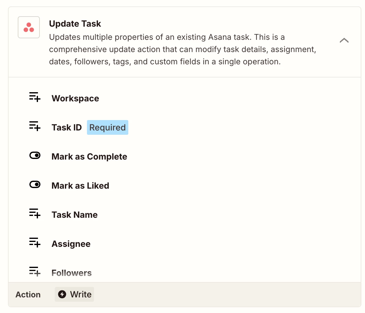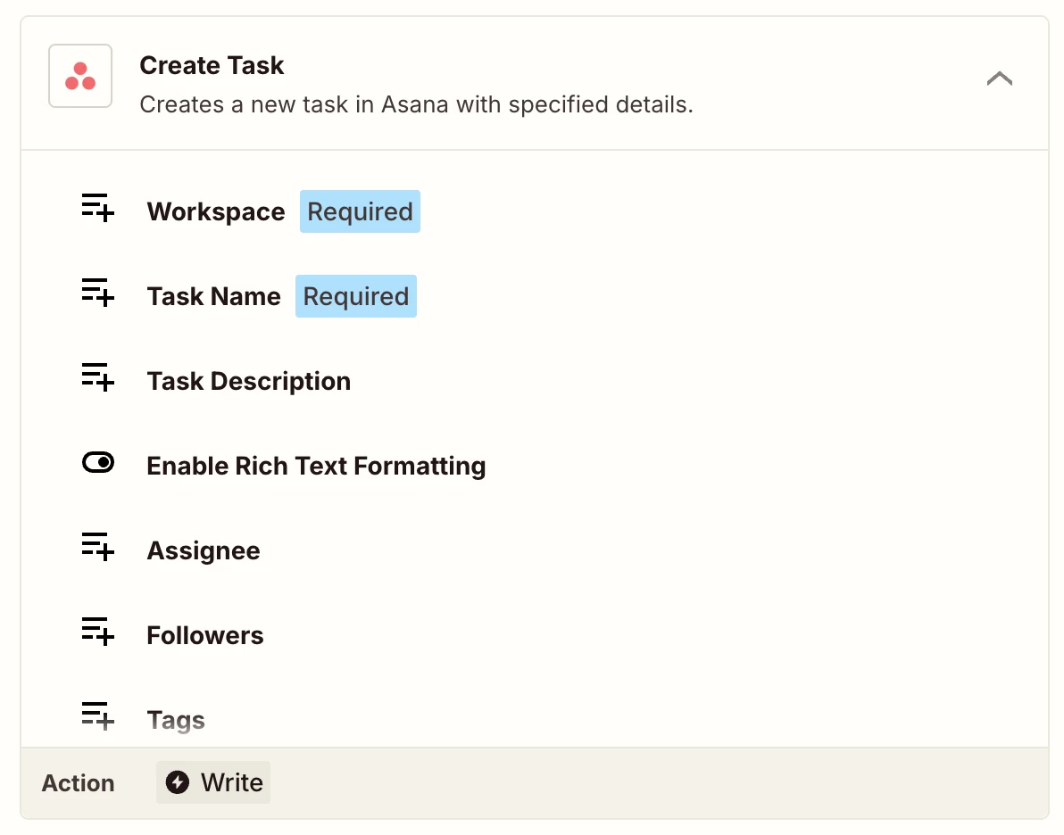 I was able to get a Zap set up that will start a new project in Asana but that’s as far as I’ve been able to get. Below is a screenshot of how the project shows up in Asana when created.