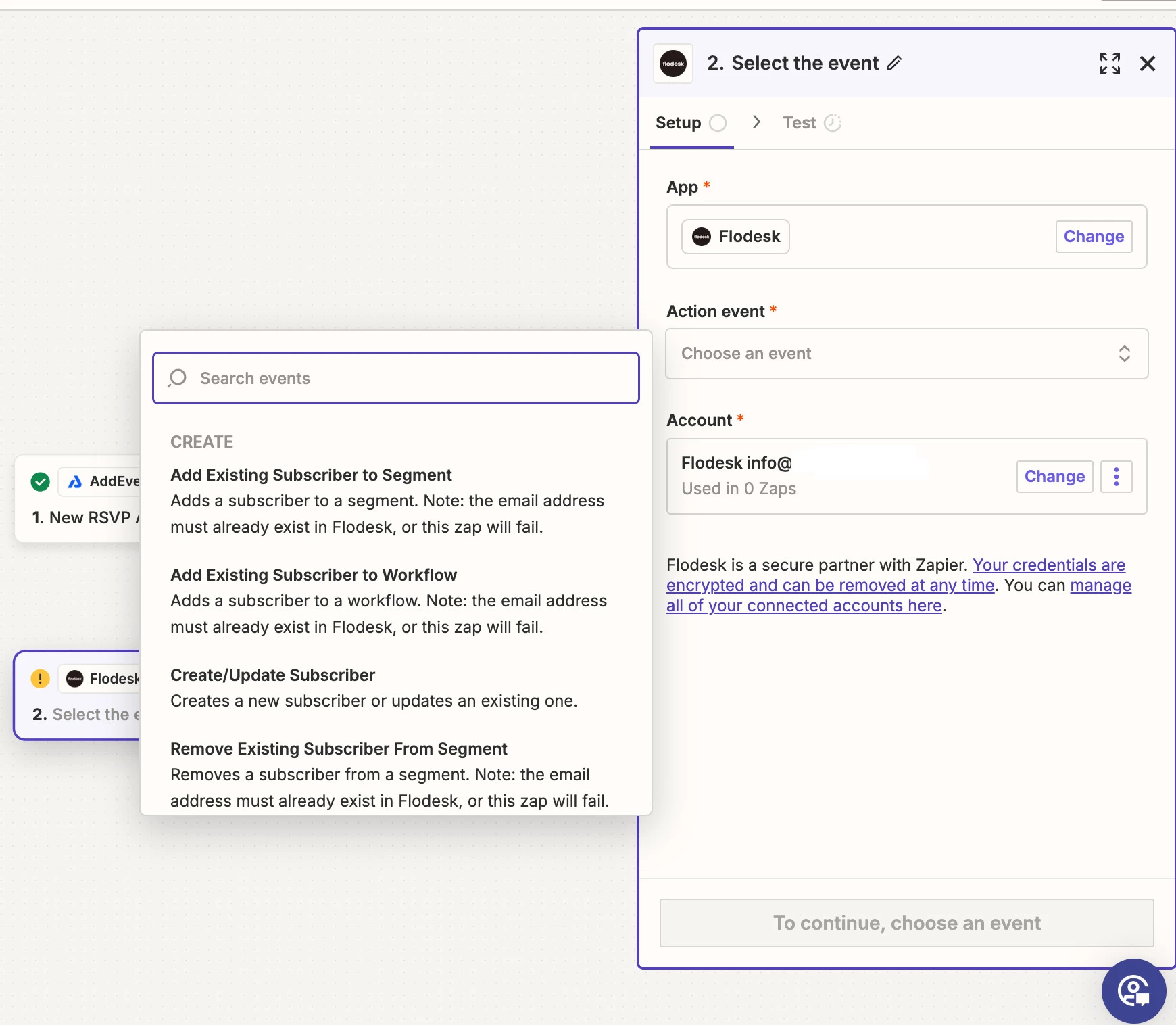 I’m feeling very frustrated by my inability to execute a simple task using Zapier. I can’t find any helpful tutorials or Q&A’s in the community, on zapier’s website or anywhere else, and the instructions here (https://www.addevent.com/integrations/50/flodesk/zapier) are not very helpful.