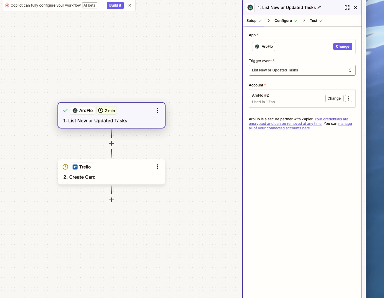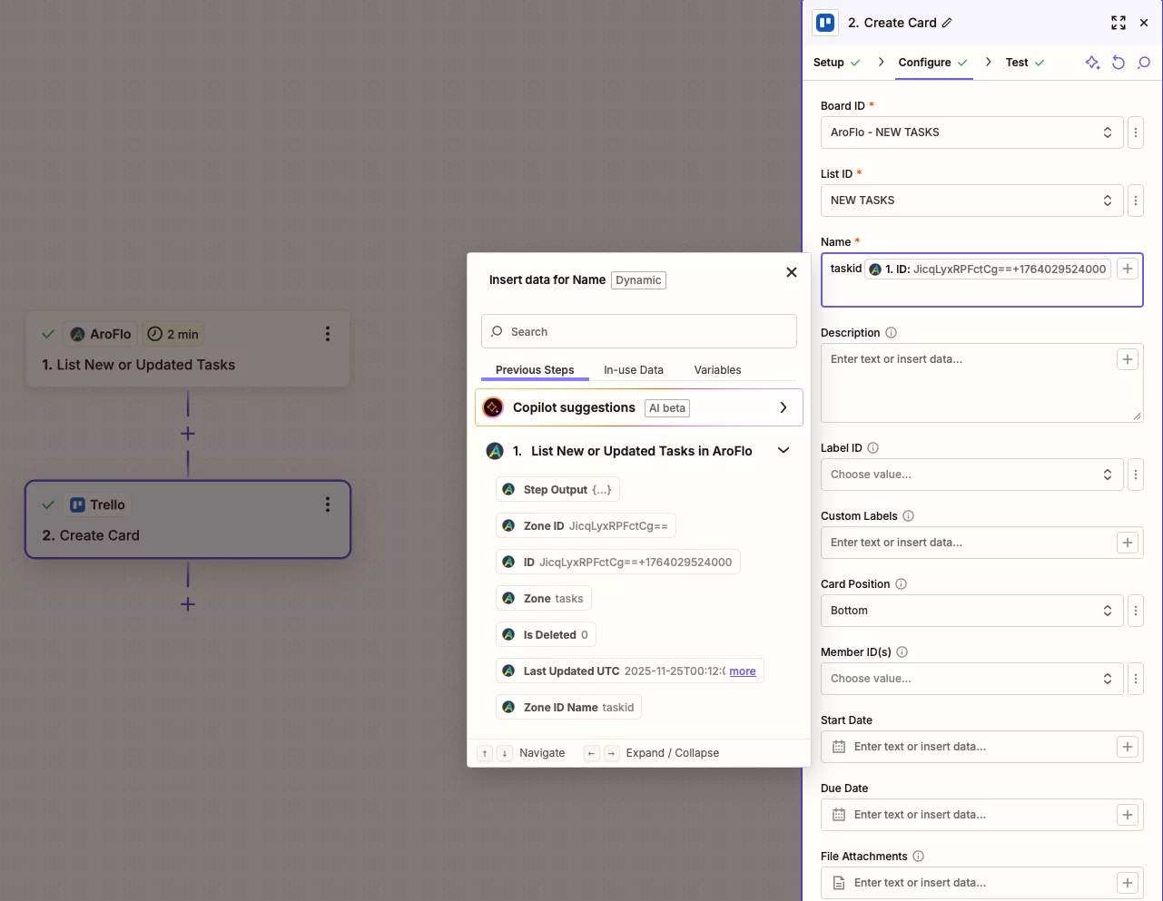 I have been able to link Aroflo and Trello through zapier. I have set up the zap for when a new task is created in Aroflo it creates a new card in trello. I have hit a problem with the naming of the card in trello. The options available to retrieve data from are limited and also don’t update the data, they remain as the code.
