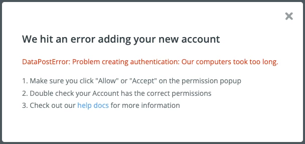 I am trying to create a connection to Redshift. After having entered all the relevant credentials (hostname, username, password, etc.), I encountered a DataPostError: Problem creating authentication: Our computers took too long. (as attached). Said Redshift credentials works as expected on other integrations we have internally and there’s no other popups appearing after I’ve entered the credentials.