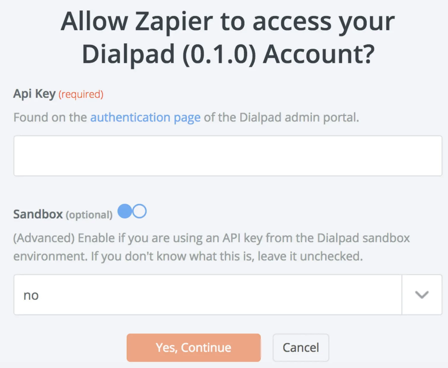 This screen does not appear nor is there option for adding the DialPad API key. It just connects with oAuth. I have disconnected DialPad from Zapier and reconnected a few times, hoping to find a place to enter the API key.