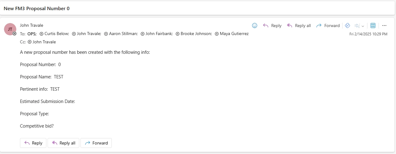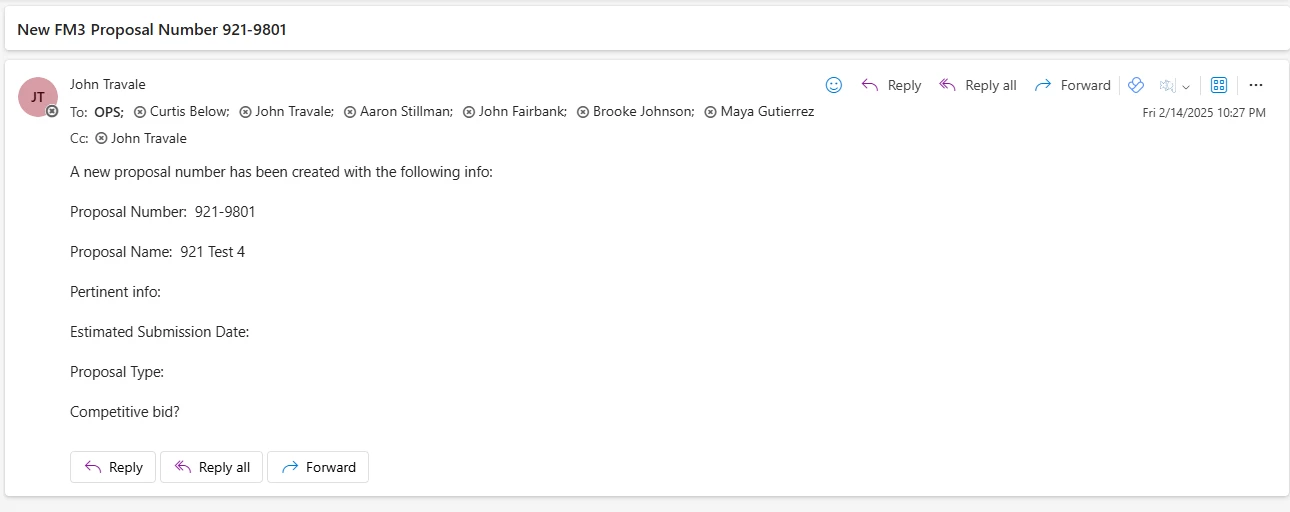 Problem - the email is not capturing the new proposal number. The test email worked fine when it was sent out (see ZapierCorrectTest.png attached - the number is 921-9801). However, when used in real time, the proposal number does not appear on the email (see ZapierError.png, where there is a zero in the subject line instead of the proposal number. All the rest of the data is captured just fine).