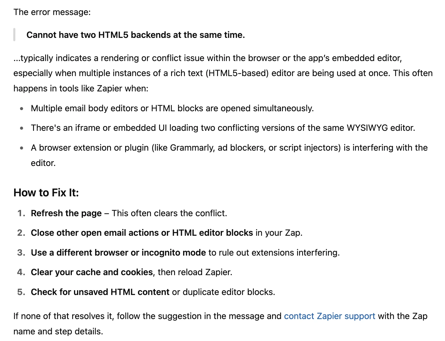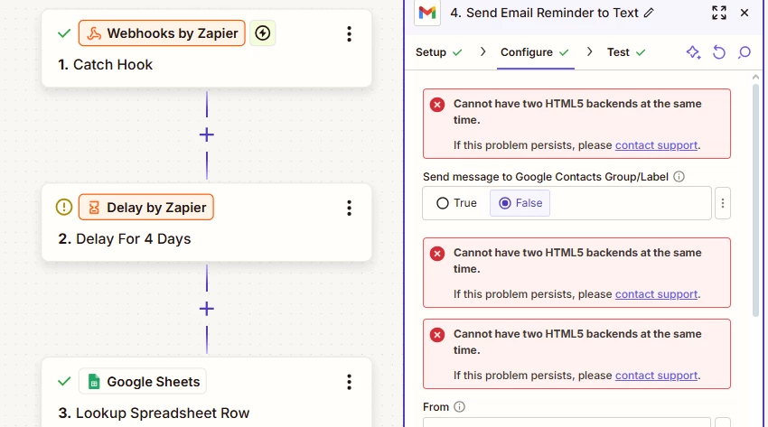 I'm trying to set up multiple Gmail steps for my automated email sequence, but I ran into this error: "Cannot have two HTML5 backends at the same time."