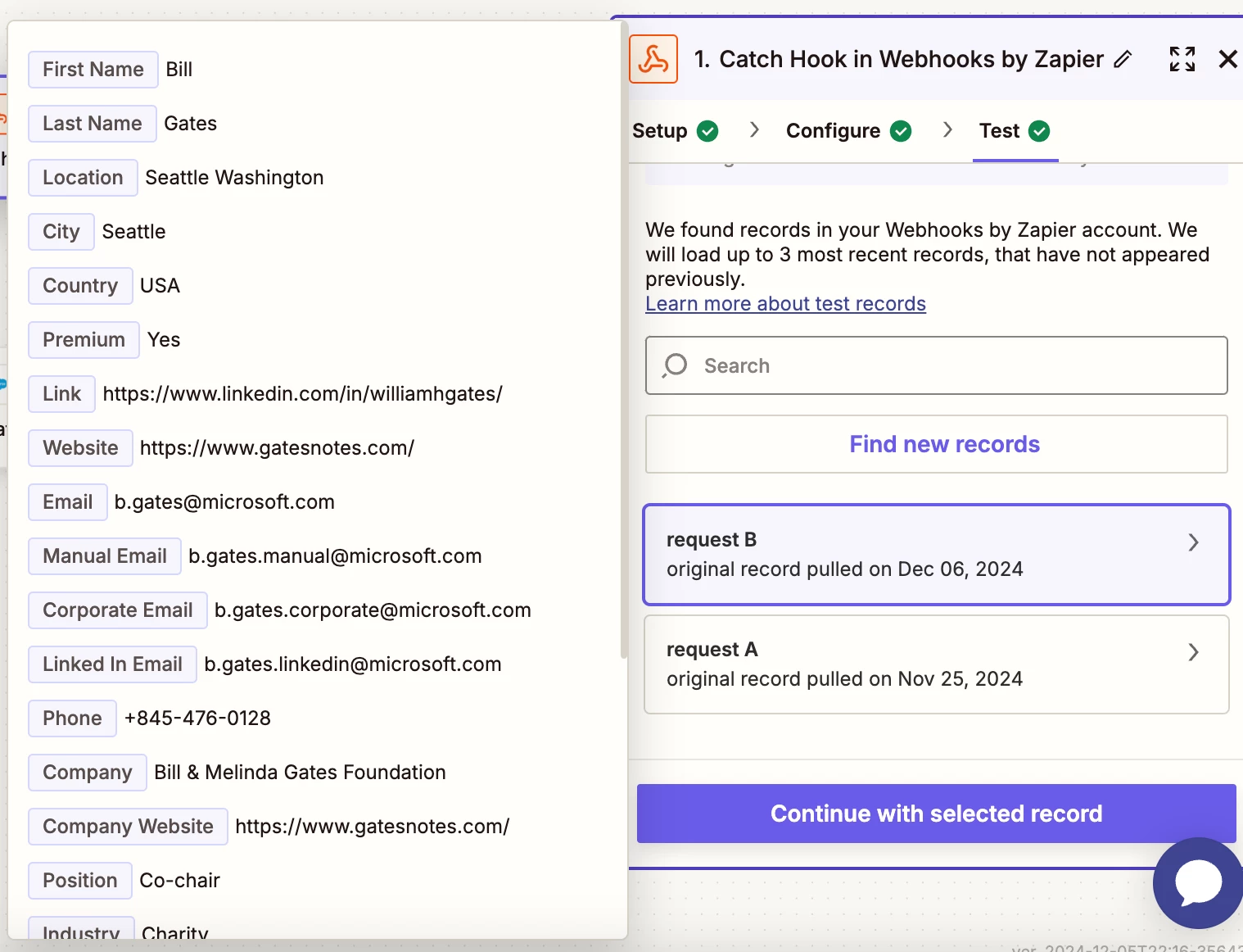 I want to push data from Dripify to Salesforce. I’ve created a Webhook Catch and pushing it into Salesforce. When i tested it zapier used dummy data (Bill Gates), and it was successfully pished to Salesforce. Problem: everytime there is a trigger to create a lead, it’s only the dummy data that is pushed again (i get new leads entered as Bill Gates, istead of x, y etc)
