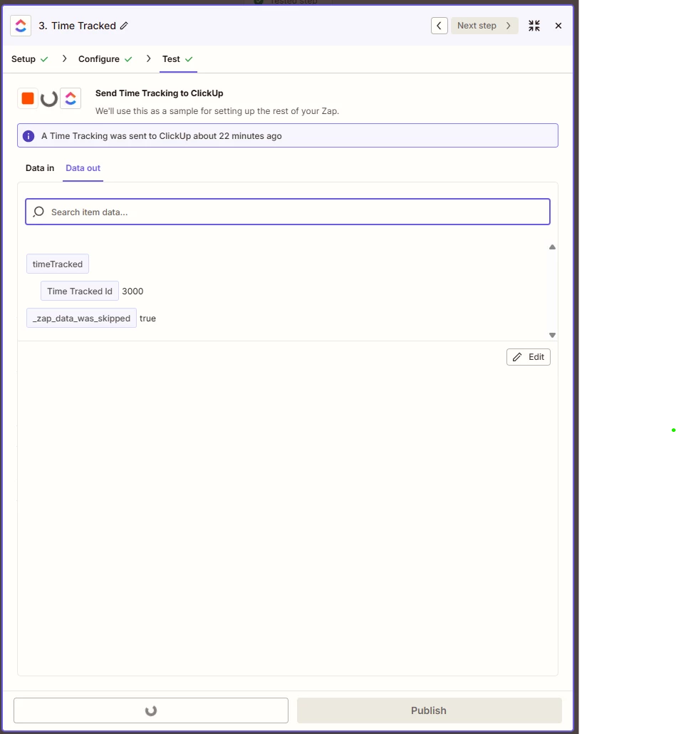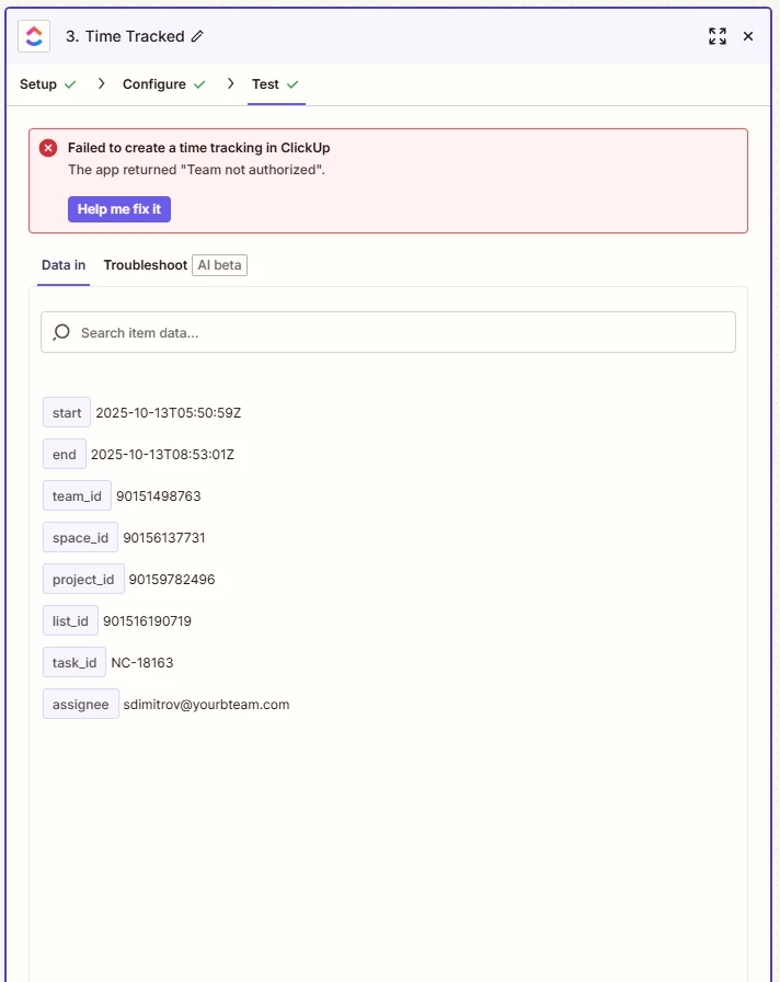 Upon creating a new time entry into ClickUp my Zap retyrned “Error: "Team not authorized".