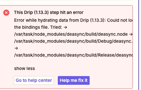 Error while hydrating data from Drip (1.13.3): Could not locate the bindings file. Tried: → /var/task/node_modules/deasync/build/deasync.node → /var/task/node_modules/deasync/build/Debug/deasync.node → /var/task/node_modules/deasync/build/Release/deasync.n