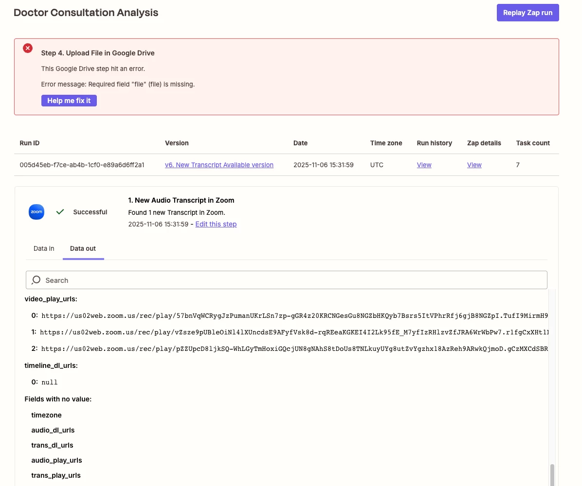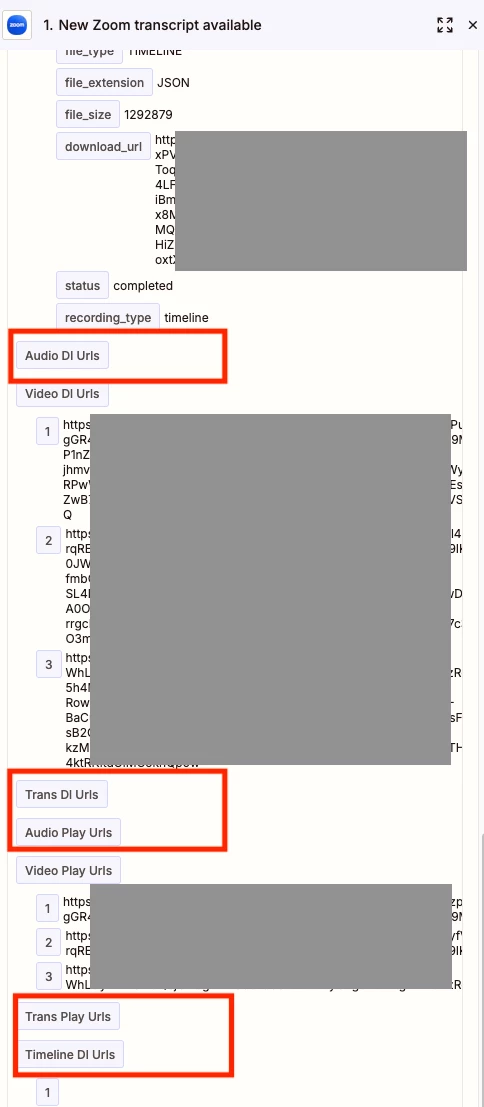 While the Zap is successfully triggered, I am unable to locate the transcript download link. I can see the video download link, but the links for both the audio and the transcript are missing.