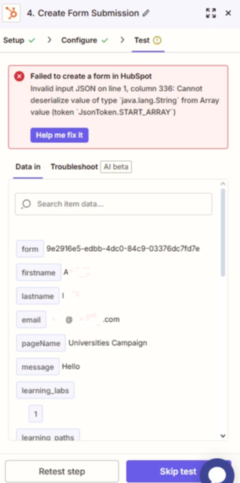 But when the data is sent to HubSpot, I get this error and the submission doesn’t go through: