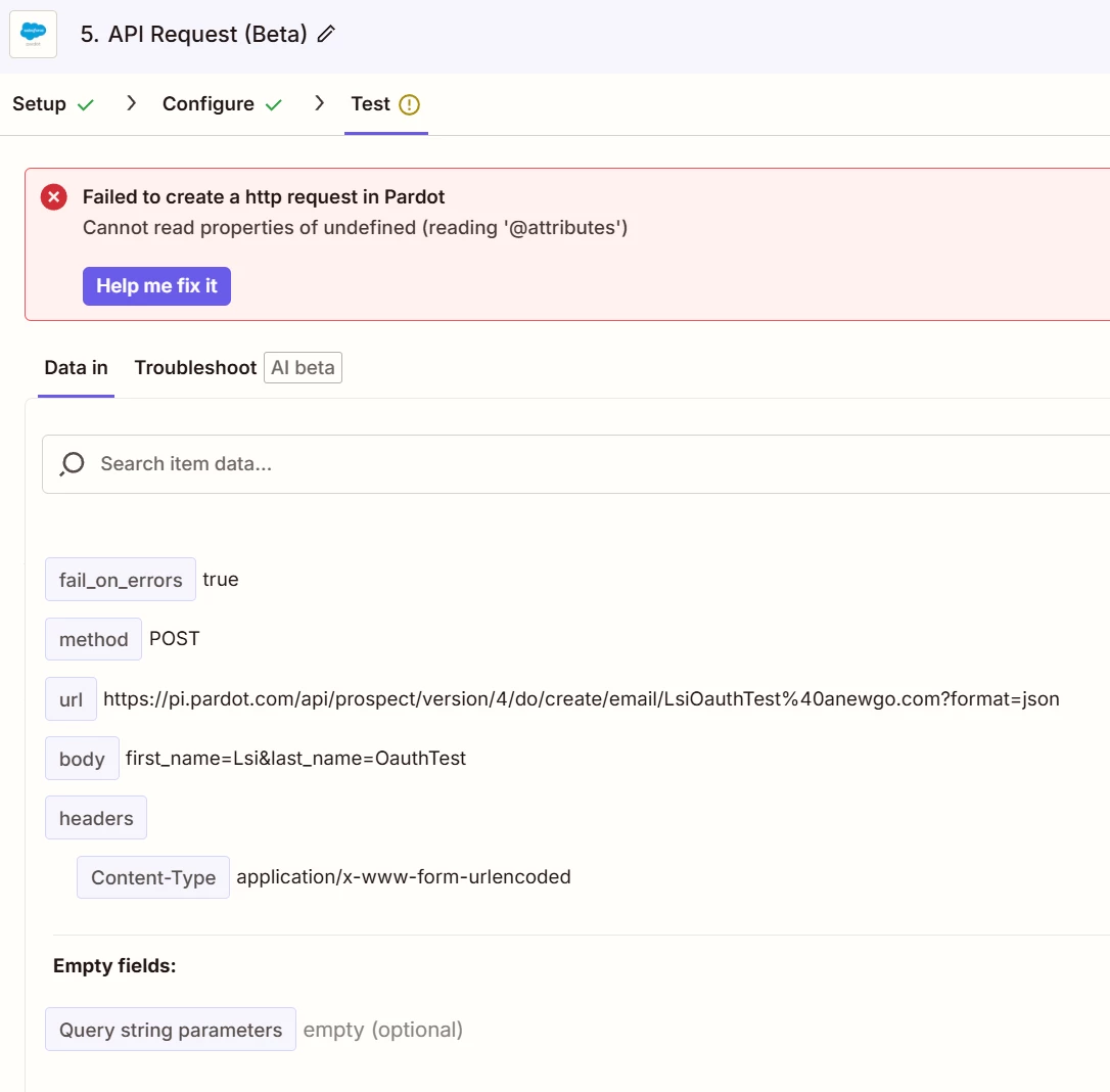 I let AI apply its proposed adjustments to my ZAP so it could attempt to solve the issue itself. It refactored my ZAP and replaced the final step (relying on an API Request) with the standard Pardot built-in Create Prospect action and achieved a successful post. This proved the connection was functional but did NOT solve the API Request issue.