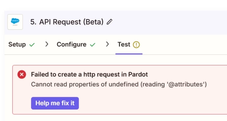 I let AI retest the ZAP - it confirmed a working V4 connection/authentication with Pardot (Account Engagement), however testing failed in the final step when attempting to use the Pardot connection to post the Prospect Create step. (Again, the same issue, Failed to create a http request in Pardot Cannot read properties of undefined (reading '@attributes').