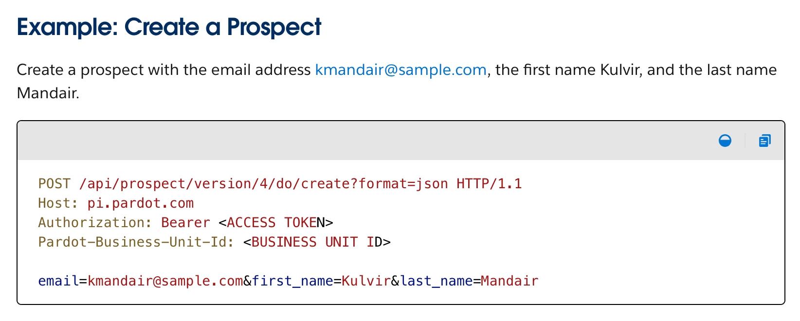 The Pardot connection was previously proven successful. Authentication was proven successful. The only requirement for creating a prospect is a single EMail parameter - which could be supplied as URL-encoded segment in the URL, or, included in the BODY section (with other optional parameters.