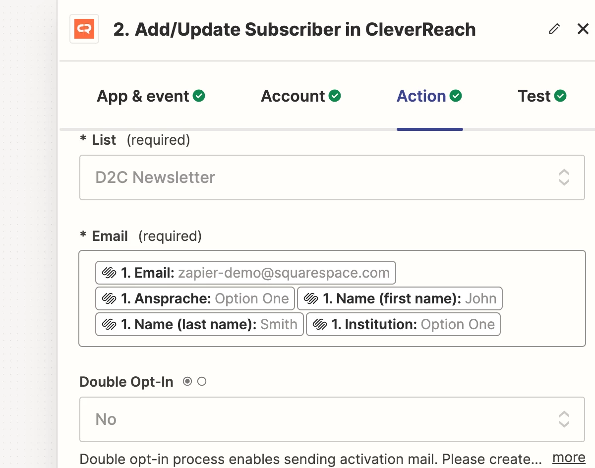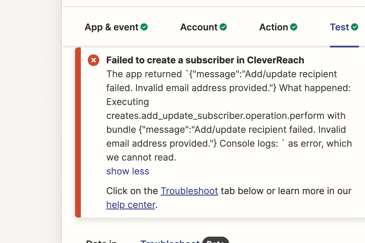 I successfully connected Zapier with our Squarespace Newsletter Form and am now trying to connect this with CleverReach. The account is successfully connected and “Action” also works but then the test always fails, producing this error: