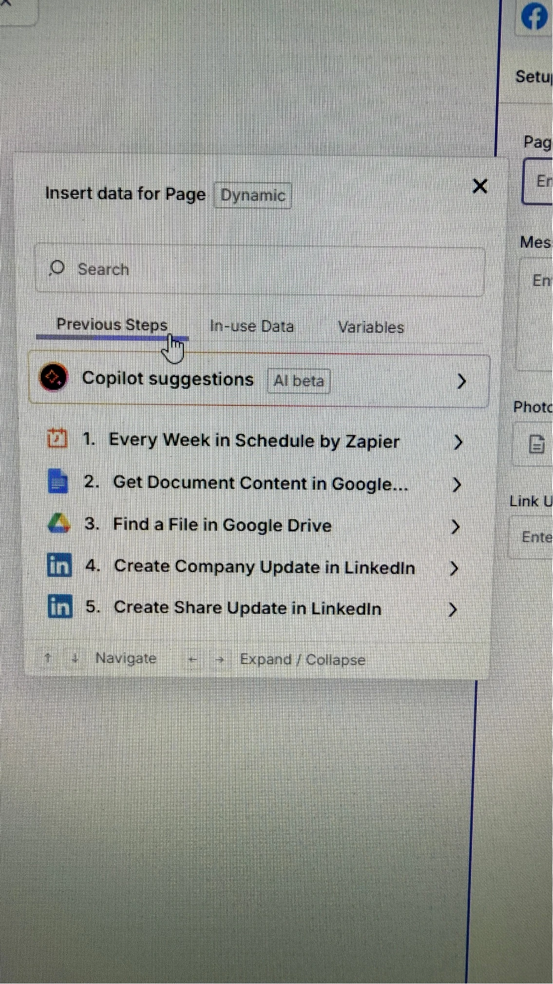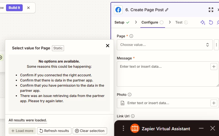 while the support chatbot and community recommend to manually input the page number, there is not place in custom input to input page number, can only select values from previous steps or system values. I already checked all the boxes in FB Page under Zapier connections.