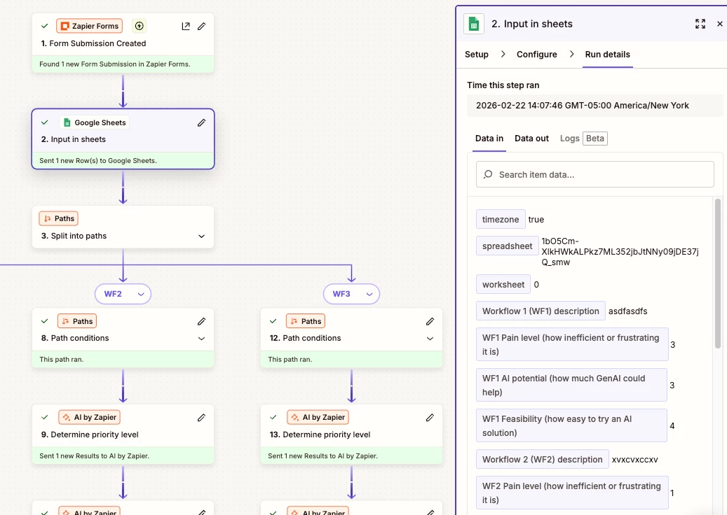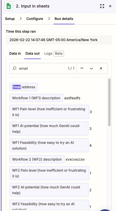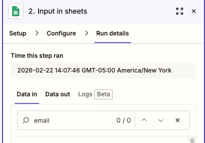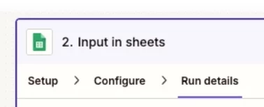 After testing the GSheets Zap step, for the RUN DETAILS tab, check the DATA IN/OUT tabs to see the data that was used as inputs and the row/data that was returned as outputs.