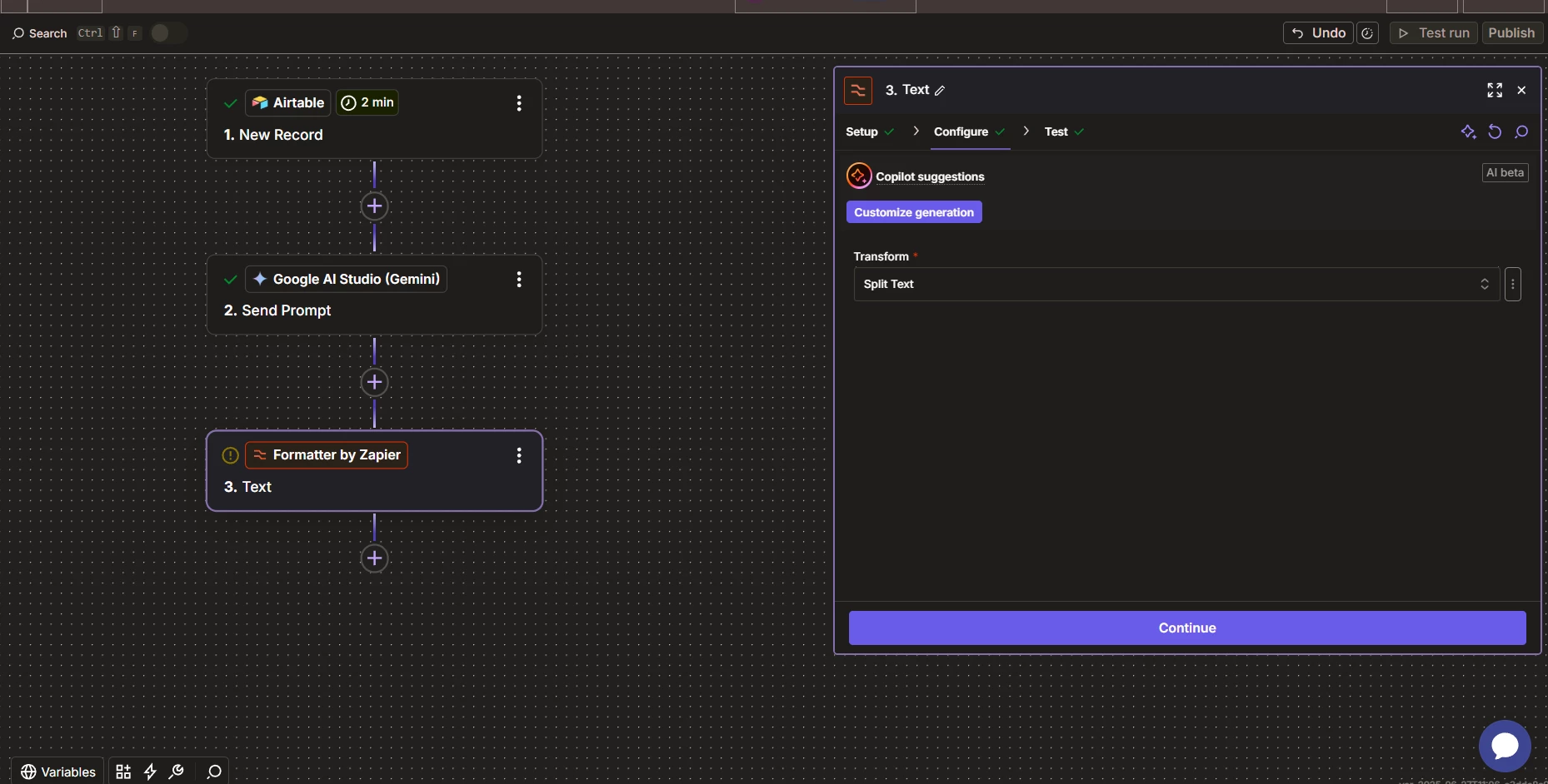 I am trying to create a formatter to split text. When I create the formatter aDnd select "split text" in the "configure" tab, nothing happens and there is no place for me to input values, seperators, etc. Why is this?