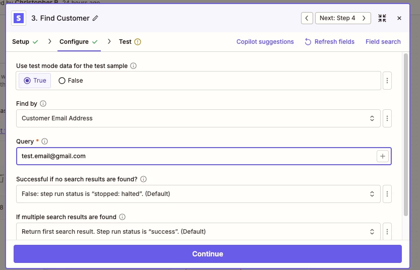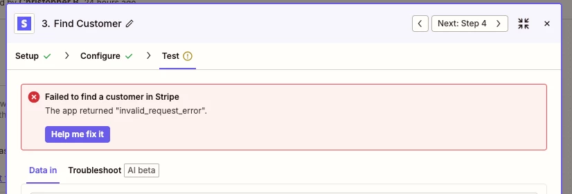 I’m using the “Stripe - Find Customer” action with the settings pictured and am receiving an invalid_request_error when testing this step. I’ve noticed that when i set Find by=Customer Stripe Id and use the corresponding id, I get a successful payload, so it seems like this is a bug with the Find by=Customer Email Address. Can we put in a fix for this?