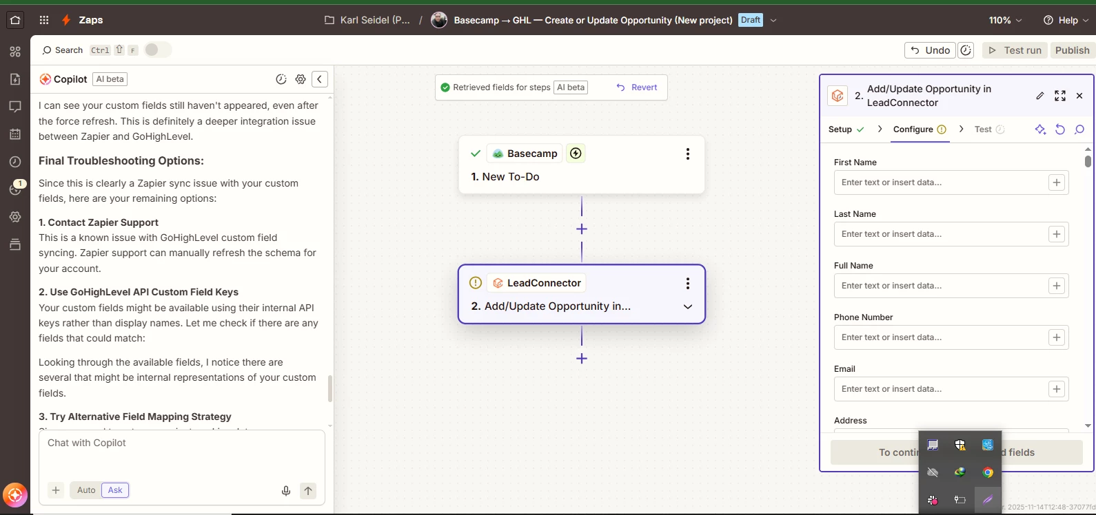 I’m running into an issue where my GoHighLevel custom fields aren’t showing up inside Zapier. I’ve already created the fields in GHL, but when I go to map them in Zapier, they don’t appear in the dropdown.