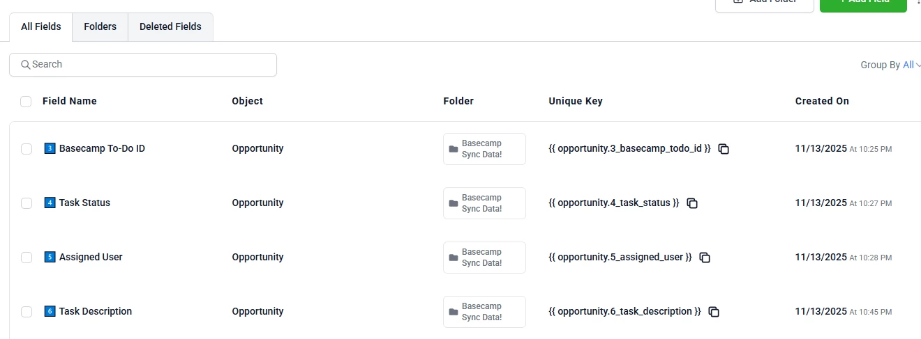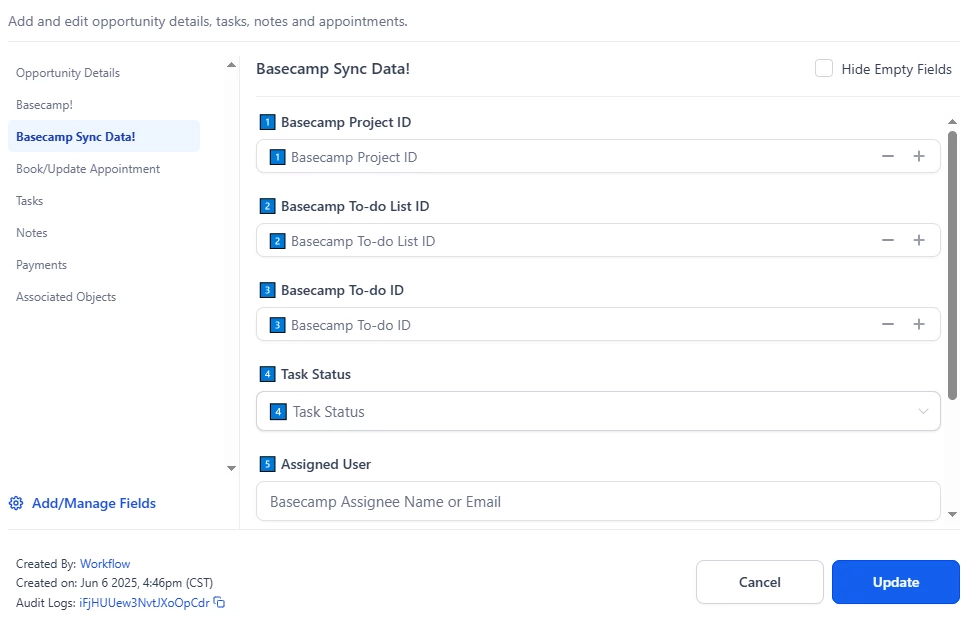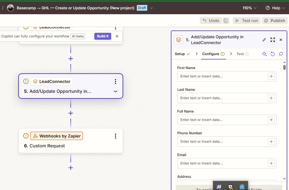When some create project in Basecamp, an corresponding Opportunity should create in GHL. So, for this to happen, Data coming from Basecamp should be mapped in GHL custom fields. But I’m stuck to find any custom fields in Zapier.