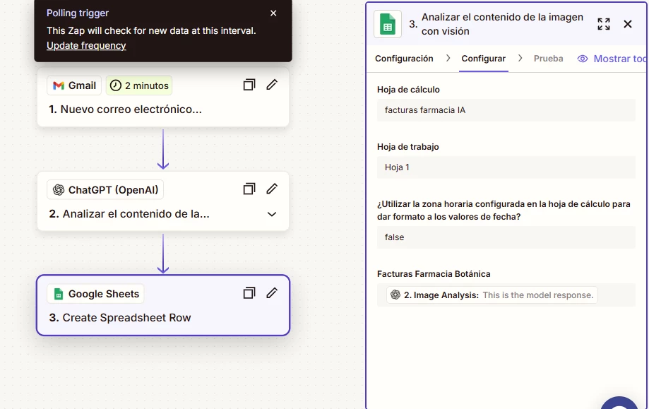 He creado un Zap para que las facturas que recibimos por gmail, extraigan la información más importante y me haga una hoja de calculo en google, con fecha de emisión,el vencimiento, el importe y el proveedor.