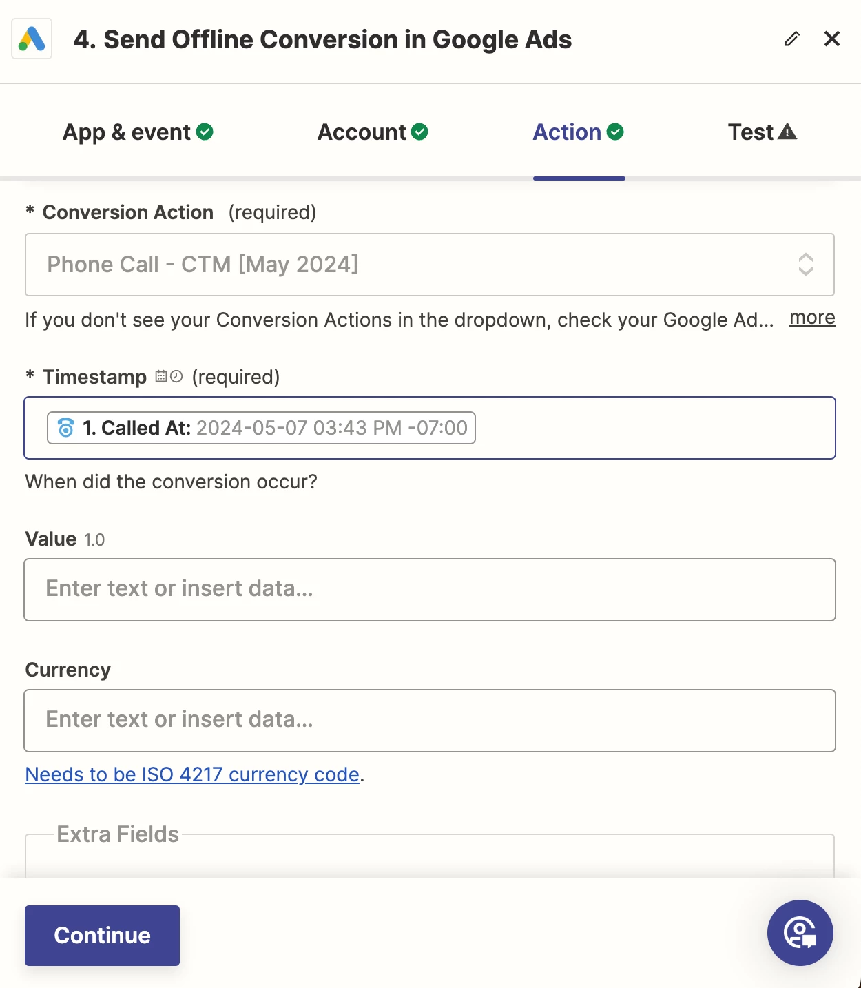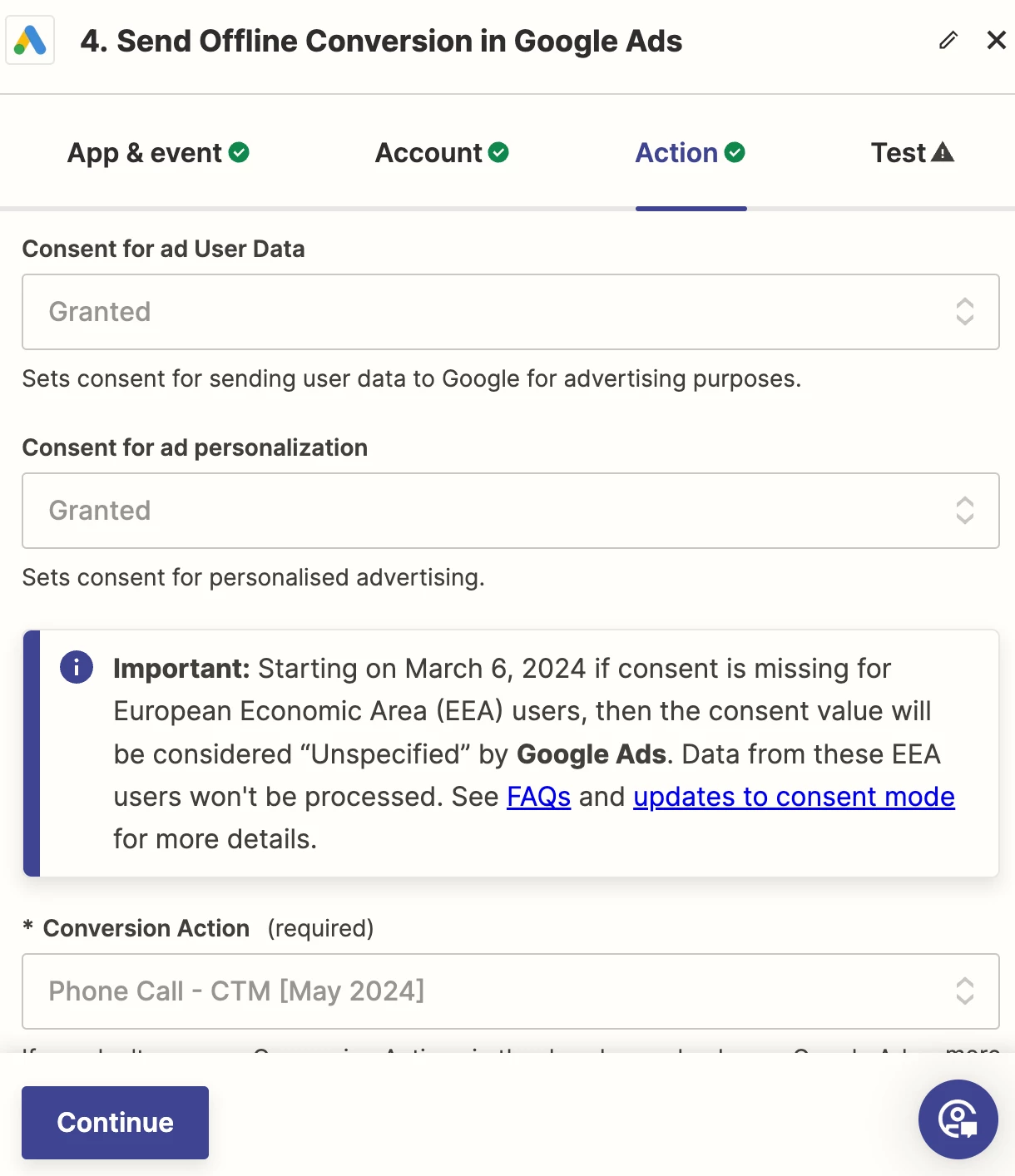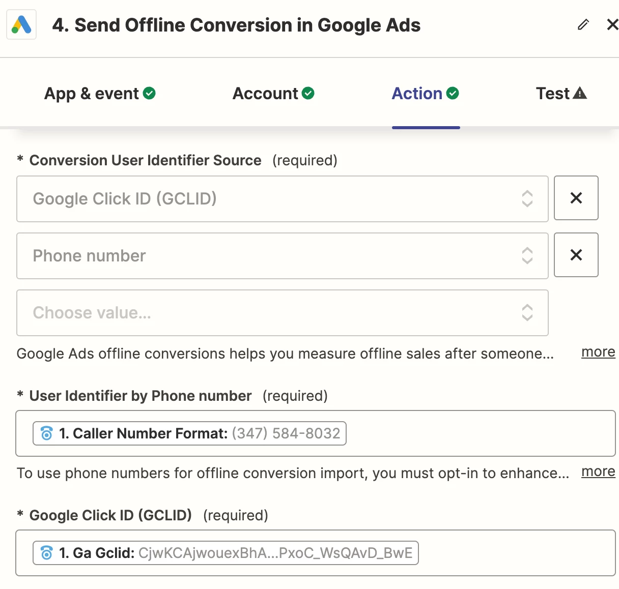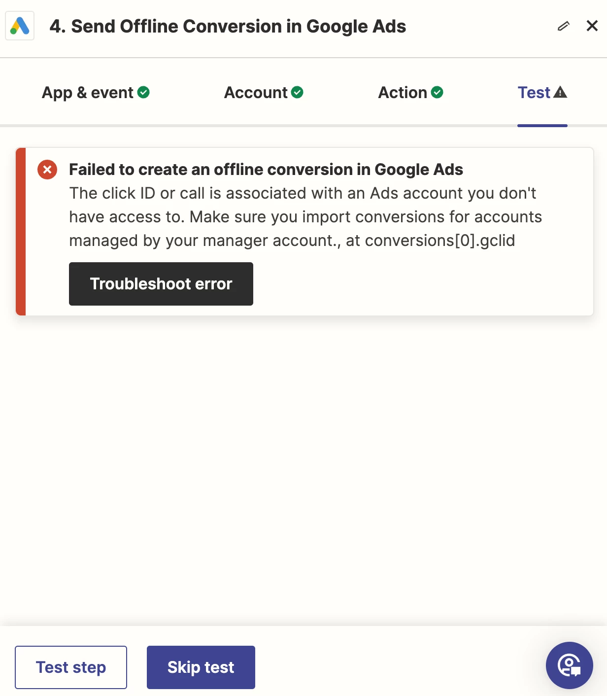 I'm currently working on uploading offline conversion data from CallTrackingMetrics to Google Ads. As I try to set up the conversion within Google Ads, it redirects me to Zapier, where I've set everything up correctly. However, I've encountered an error message related to “Failed to create an offline conversion in Google Ads. The click ID or call is associated with an Ads account you don't have access to. Make sure you import conversions for accounts managed by your manager account., at conversions[0].gclid”