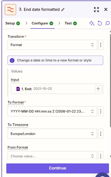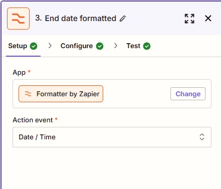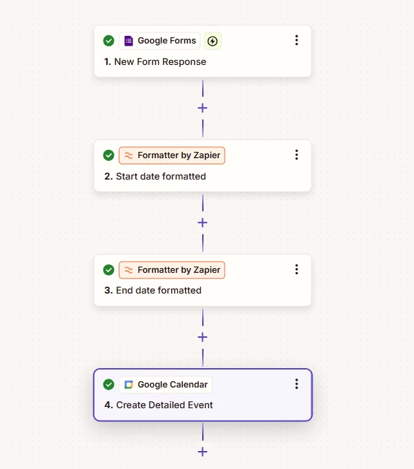 To ensure your Google Forms to Google Calendar Zap works correctly, format the date and time in ISO 8601 (for example, 2025-04-01T15:30:00Z). You can guide users in inputting data in this format or use Google Sheets to combine separate date and time fields. Incorrect formatting may cause issues with start and end times.