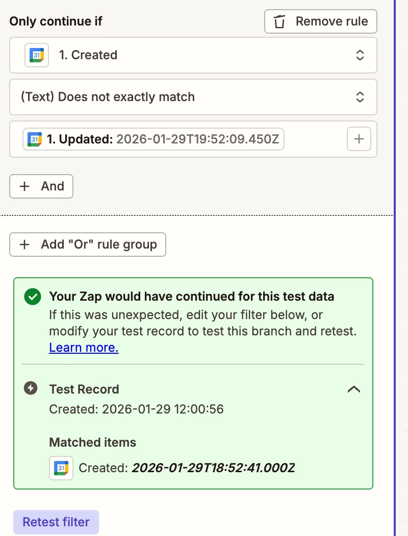 I have been struggling to configure my Zap so it will only trigger if there is an update on the Google calendar event.