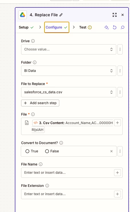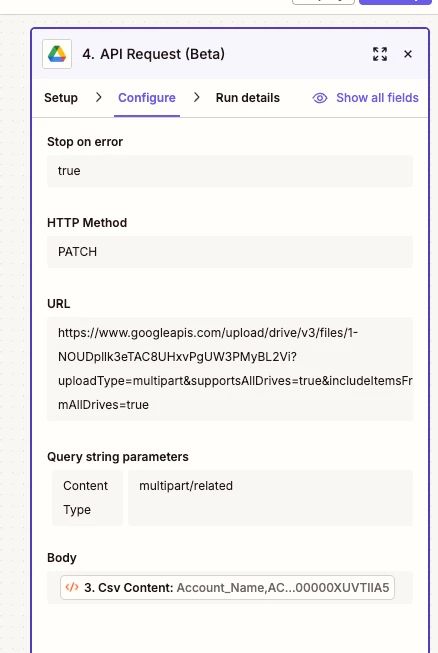 I am trying to use the Google Drive API Request action to update a CSV file in a Google Drive folder. The Replace File action seems to always overwrite as a .txt file, so this has been the best workaround. It’s working as expected in test mode, but when it runs for real, I keep hitting this error: