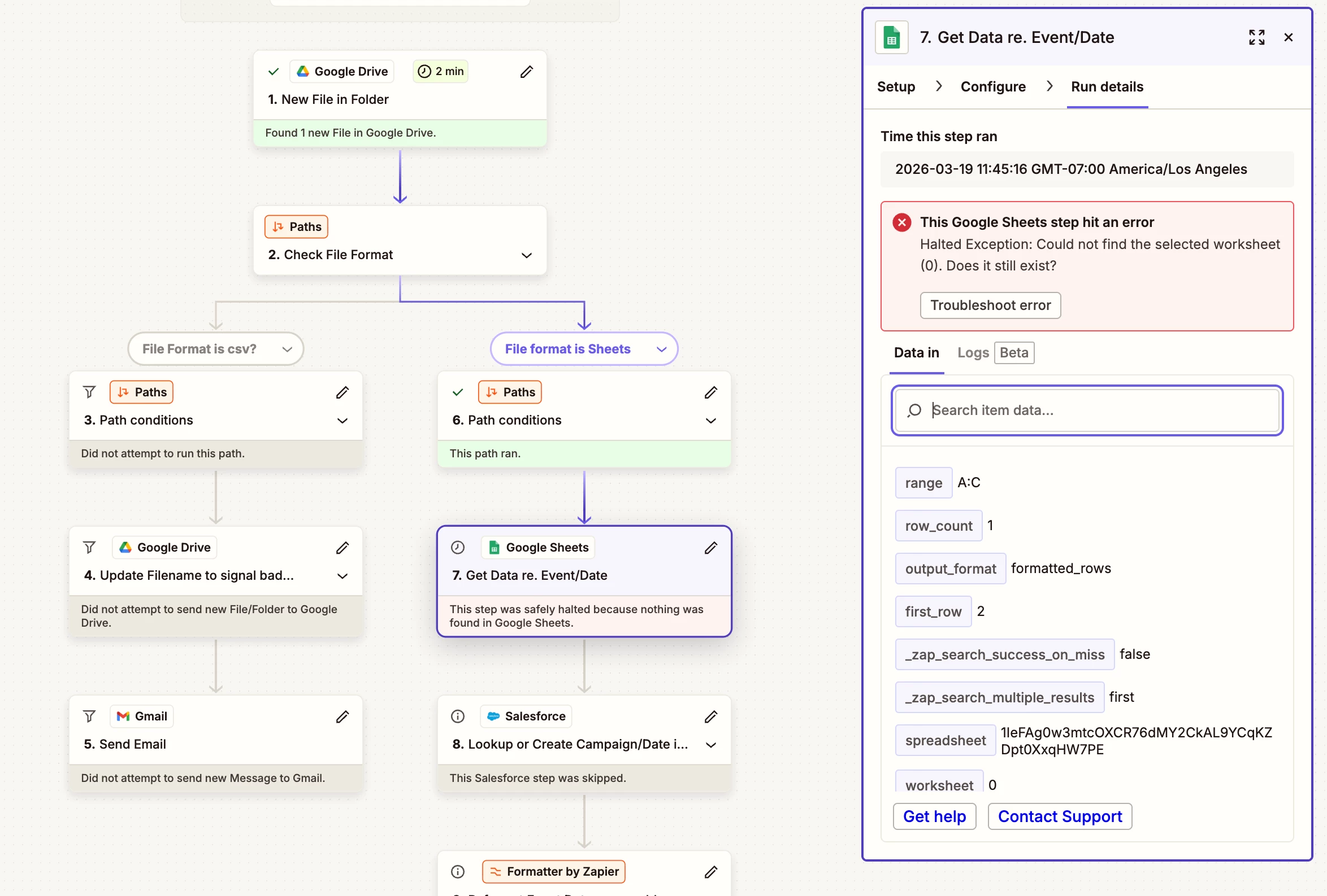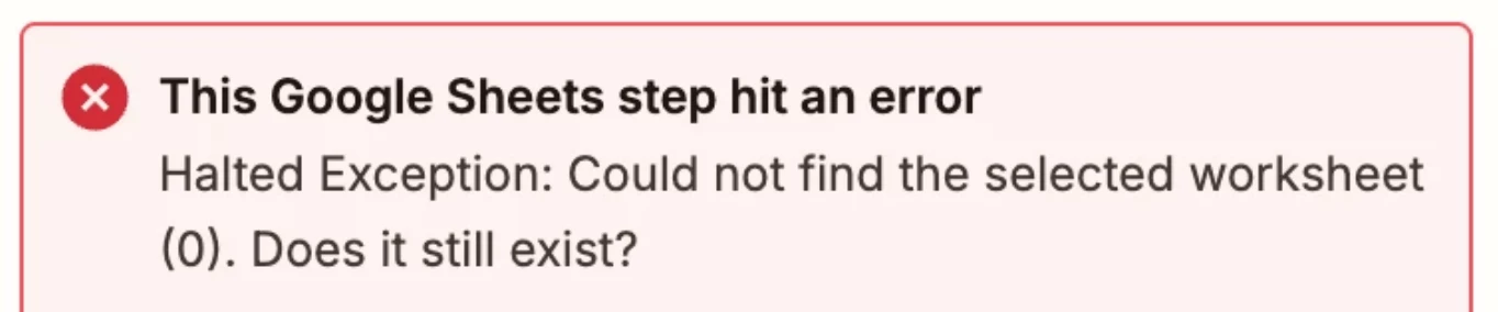 My zap is consistently halted “Safely” at this step, and I am getting error “Halted Exception: Could not find the selected worksheet (0). Does it still exist?” Screenshot showing the runtime data below: