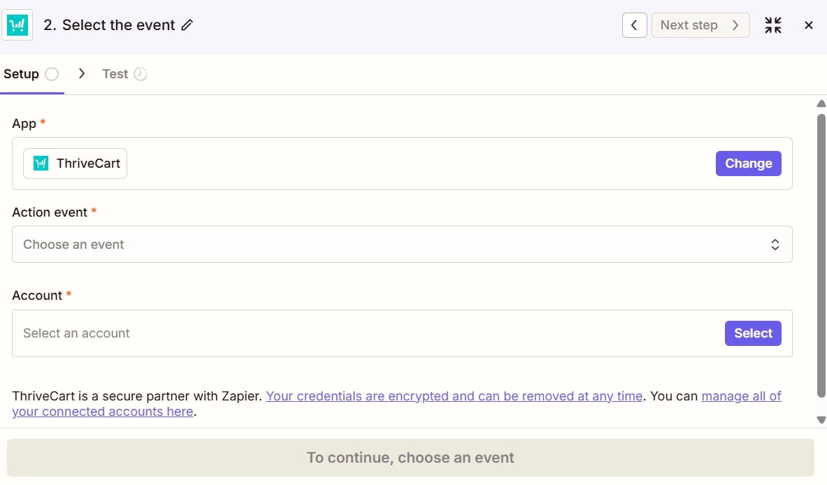 In the pic below in step 2, when I select the event, and pick Thrivecart as the app and then go to select the action event from the drop down, it does not have any options of picking a standard event. It forces me into using a custom event (which is in Beta).