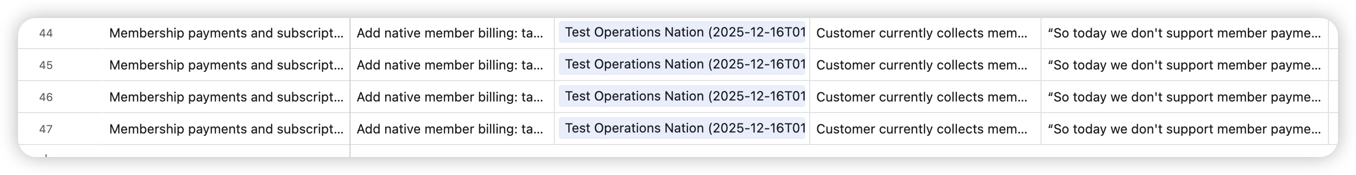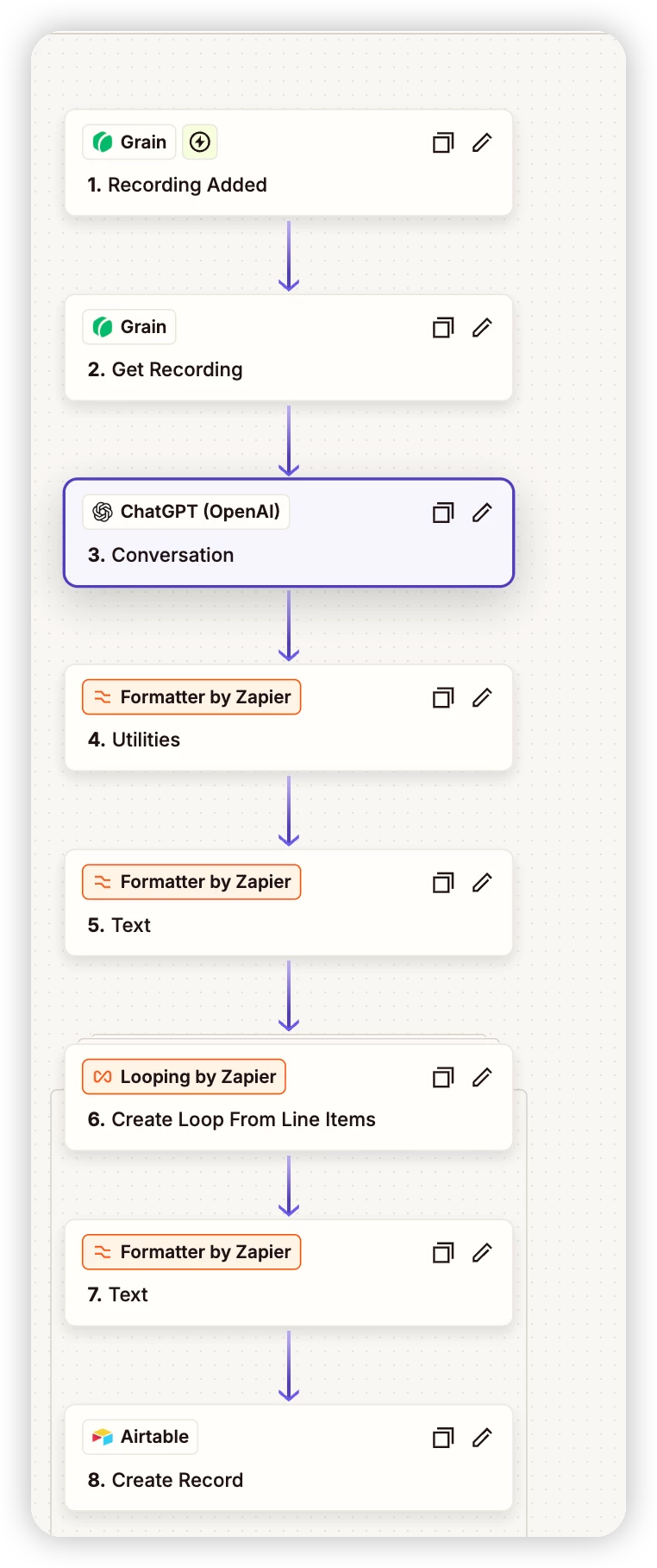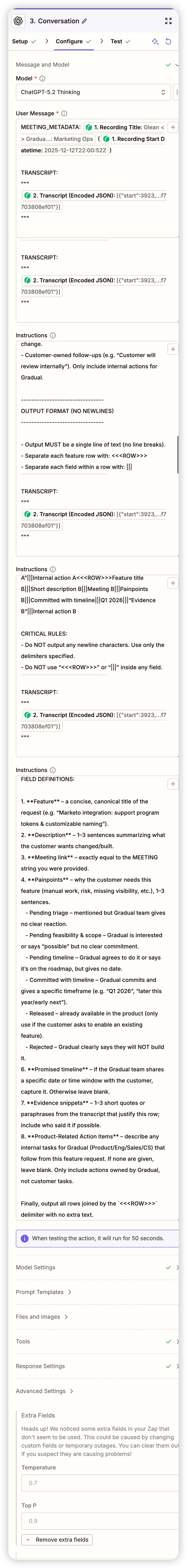 I have a Zap that takes the output from OpenAI/ChatGPT and creates feature‑request records in Airtable. The AI returns multiple rows in one string, using a custom row delimiter (<<<ROW>>>) and a column delimiter (|||). Each feature row includes the fields: Feature, Description, Meeting link, Painpoints, Status, Promised timeline, Evidence snippets, Product‑Related Action Items (so no “Requested priority”).