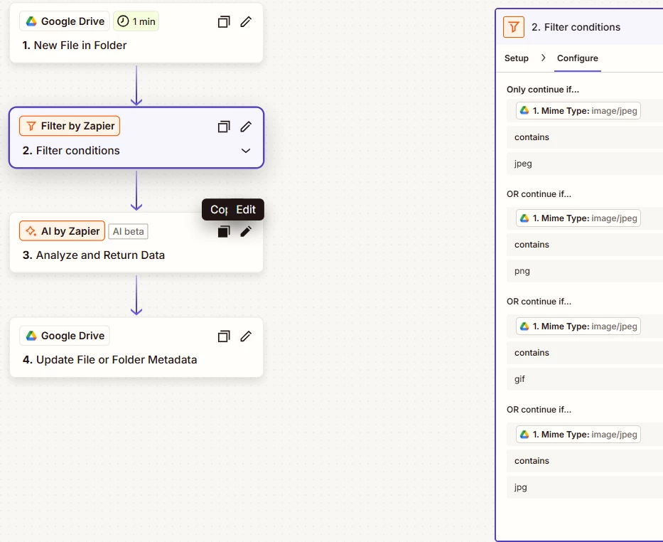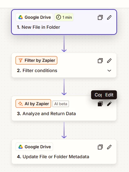 Flow: Zapier Tables > Filter > Delay > GDrive > AI > GDrive > Zapier Tables