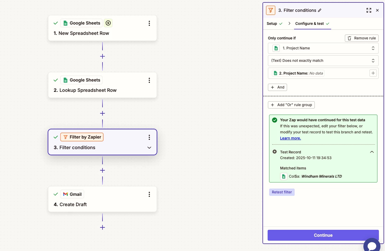 I have a master spreadsheet of leads that I will update daily. I will copy and paste those leads in the same format every day. I'm trying to make a zap that looks at new rows created then looks up previous rows by a column called "Project Name". If project name does not already exist then I want it to continue forward with the zap and write a draft email. The zap works perfectly however the filter is not filtering out duplicates. Here is what I have. How can I change this?