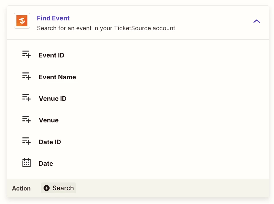 Hi, no unfortunately not. The output fields from the New Booking trigger event just don’t appear to offer any useful fields for getting the TS event information, eg. event name or event date. See attached screenshot. Getting customer data (from TicketSource Customer ID) works fine, but there’s no handy TicketSource Event ID