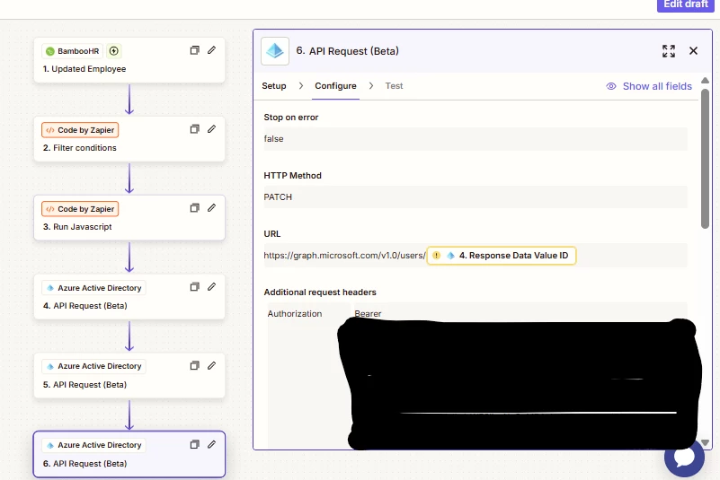I do have this workflow that is triggered when user information like mobile number, job title, location, and line manager is changed in BambooHR, and it should auto-update them in MS Entra (Azure AD).