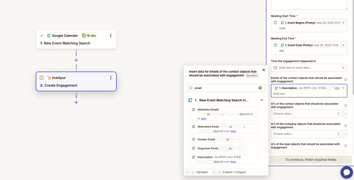 I am using Google Calendar’s new event matching search as a trigger to create a HubSpot engagement. However, there is no property that passes only the requester’s email information from the meeting. Because of this, I cannot connect the meeting engagement with the appropriate HubSpot contact. How can this issue be resolved?