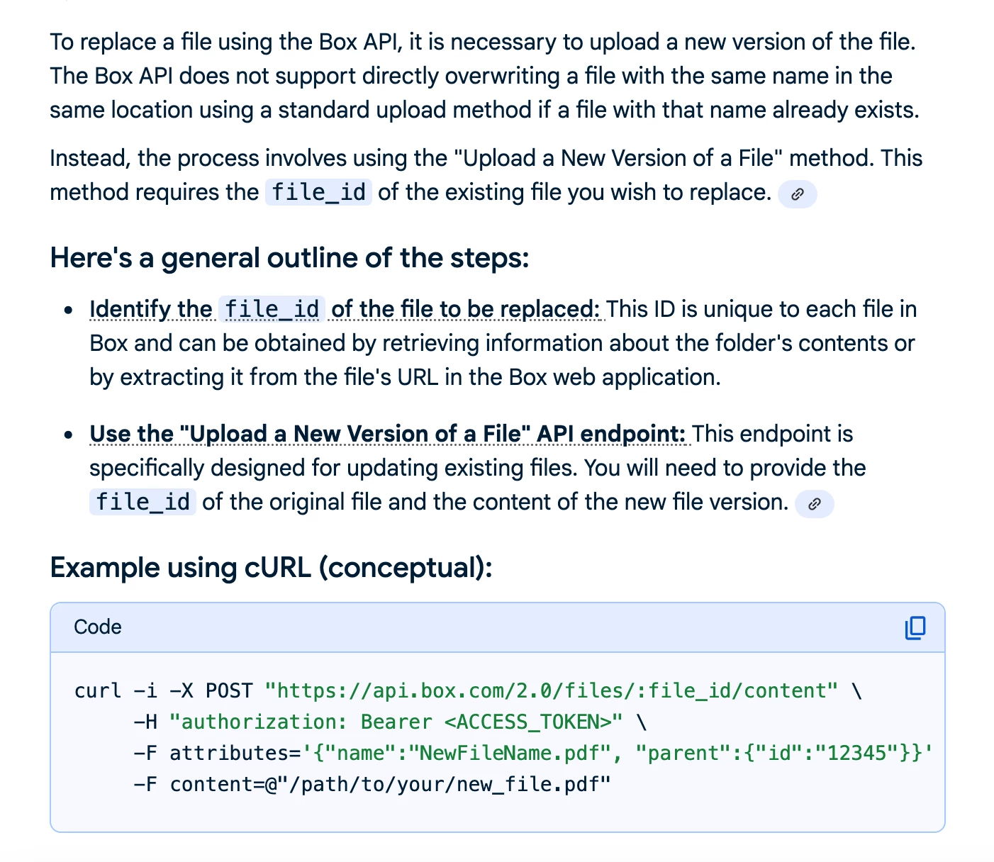 WIth Box however, while I can find the file, I do not not appear to have options to upload into that found file, replace it, or simply delete it before upload.
