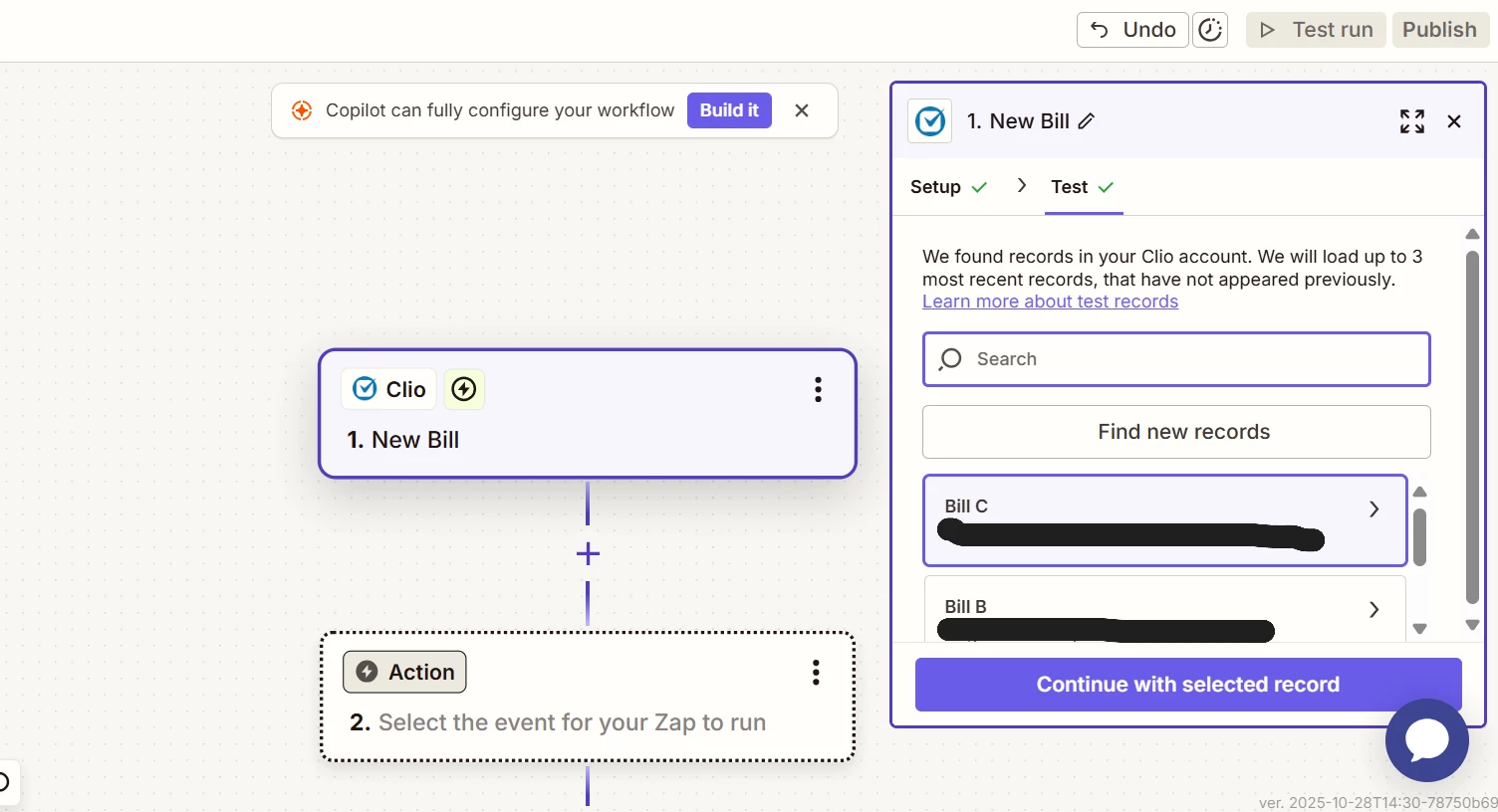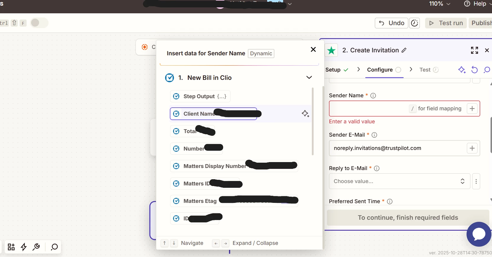 I am trying to create a zap which, when a new bill is created in Clio, triggers an email from Trustpilot to be sent to the client requesting a review.