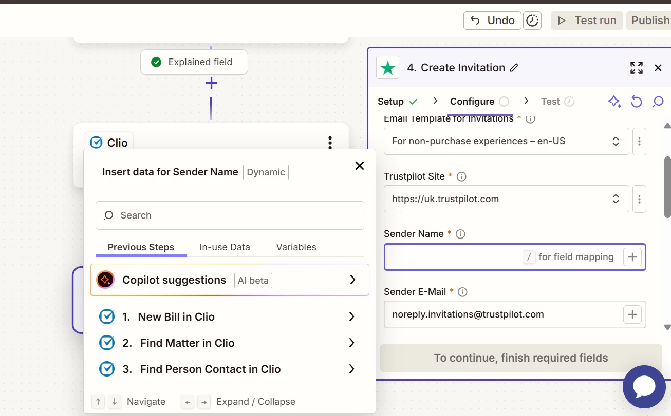 With assistance from Trustpilot I have been able to set up the first step; however, when we tried to set up the second step (‘create invitation from Trustpilot’), Zapier was not able to pull the client’s email address from Clio. We tried adding an intermediate step – ‘Find Person Contact’ – but this didn’t work either.