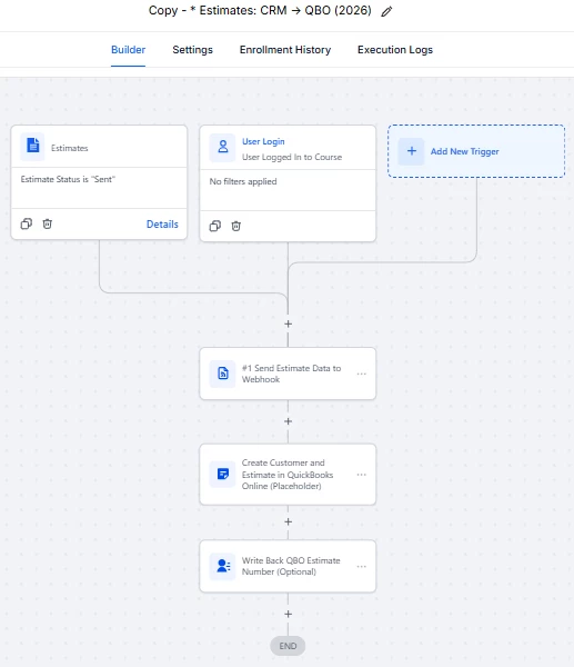 Some context: we are using GoHighLevel CRM for our customers, and Quickbooks for all financials. We are currently implementing the native CRM→ QBO integration (which allows for invoices to sync) as well using a workflow to allow estimates to sync since the native integration is only at the invoice level and not the estimate. The goal is to have estimates (EST) created in CRM, synced to QBO which then creates that EST as well as the Customer***, then we convert the EST to an INV within QBO for payment.