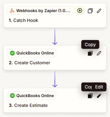 *** The missing step we need is with any pre-existing or current customers in QBO. When the CRM attempts to send an EST to a customer that is already in QBO (for an additional order, for example) we are getting a ‘duplicate name exists’ error email from Zapier.