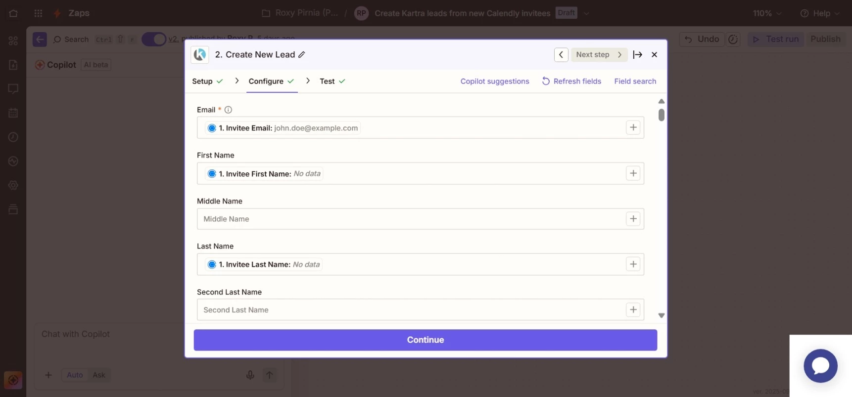 Please reference the attached screenshot. I created a Zap: Once a Calendly invitee is created, a new lead in Kartra is created. I tested the Zap, but the Calendly invitee did not appear in Kartra. How do I get the Zap to work?