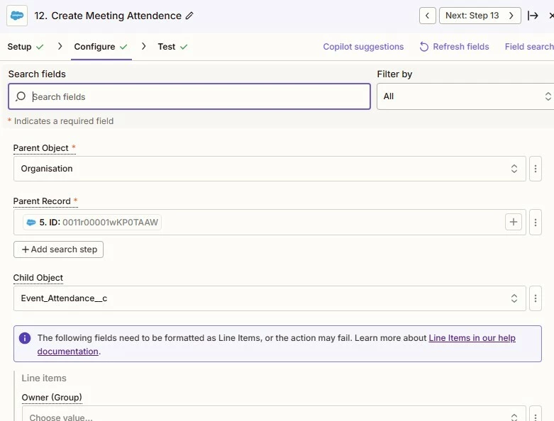 I am trying to crate a Salesforce record using a submission from a JotForm. Some of the fields in the Zap, have a warning about the fields needing to be formatted as line items. I can select a static input and the zap works fine, but I need to input custom data from a JotForm submission.