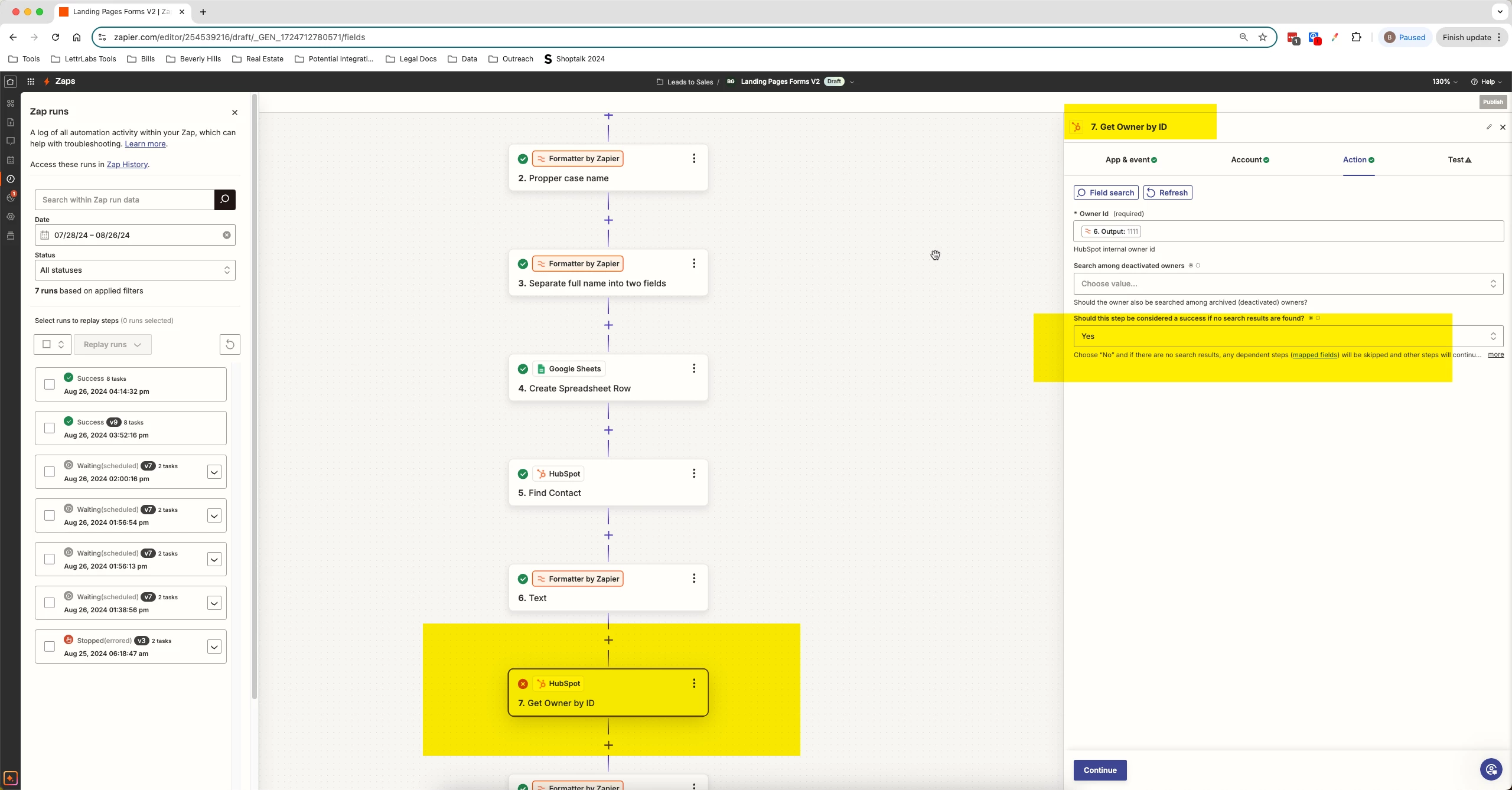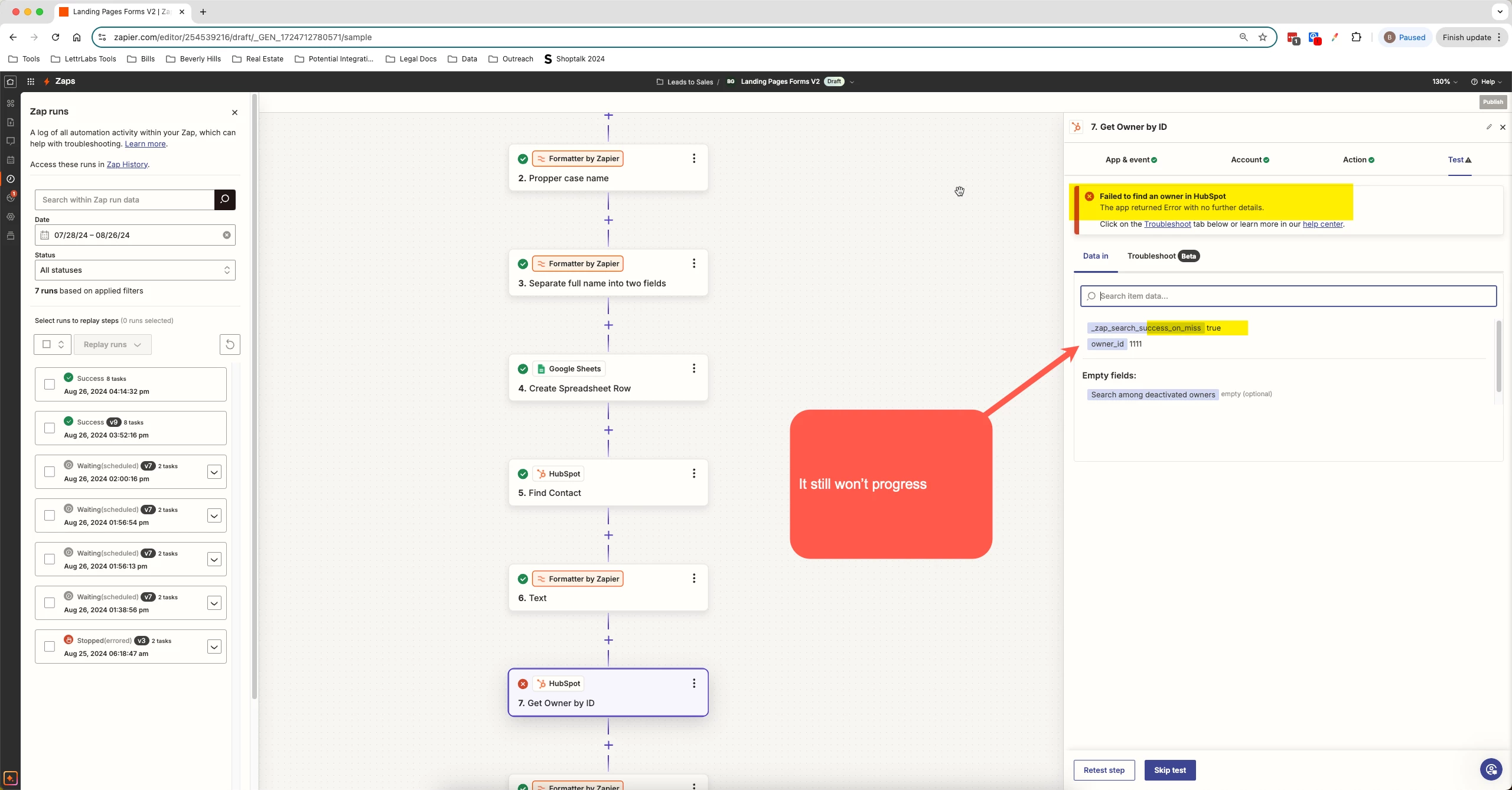 Basically I’ve found that I can add a error handing step on the rear of the get owner by ID to make the zap technically work, however Im still getting error messages. Does anyone understand how we can get past this issue?