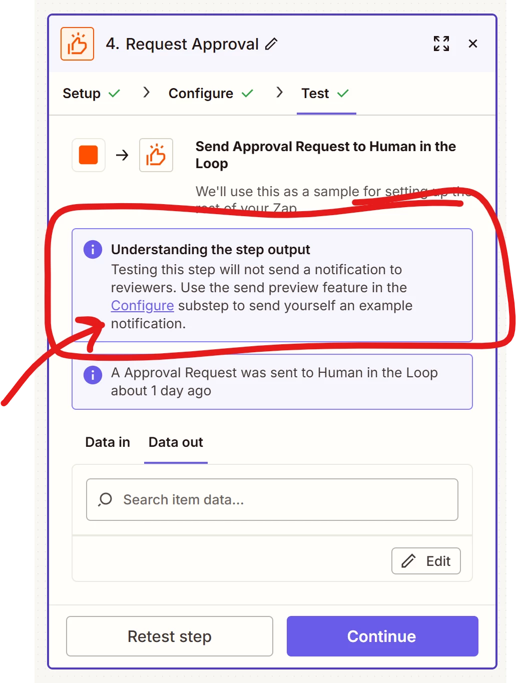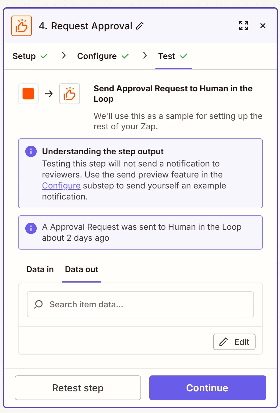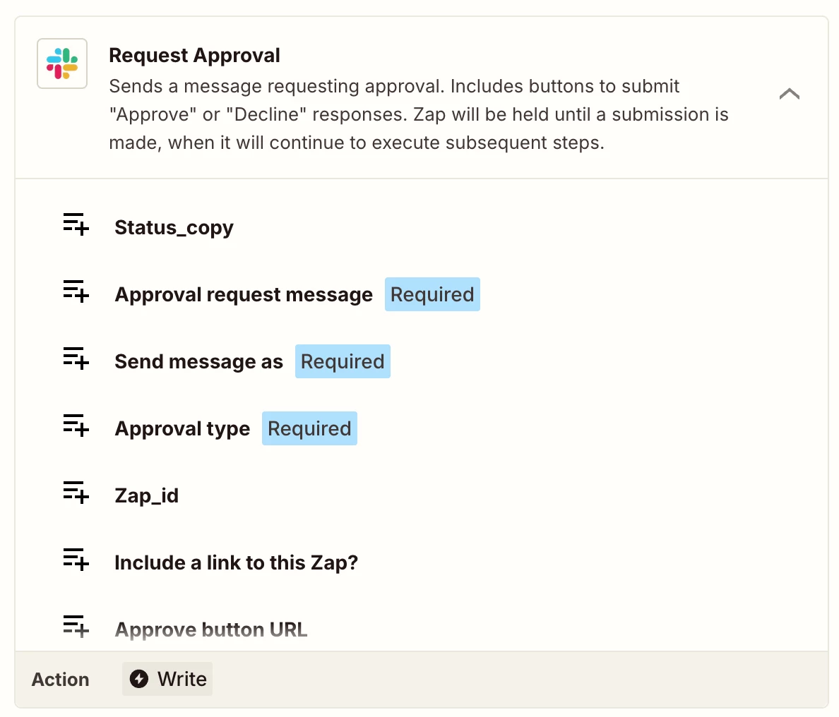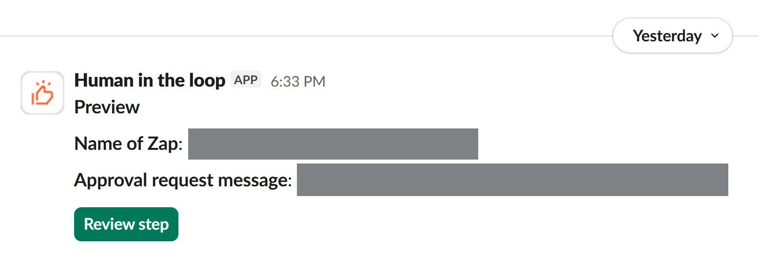 In the actual workflow, it just asks me to manually approve it. It also says “A notification was sent...”, but it wasn’t sent to Slack, evidenced by not seeing any messages from Zapier, and I got the failure email about it from Zapier: